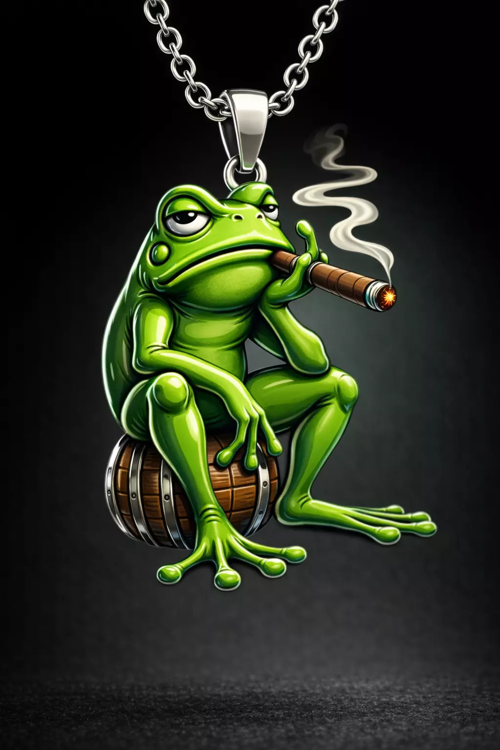 This masterfully sculpted design features a chilled-out bullfrog leaning on one hand while smoking a detailed cigar, perched atop a realistic wooden barrel. The piece perfectly balances humor with high-end craftsmanship, making it an ideal choice for unique streetwear jewelry, EDC charms, or desk toys.
