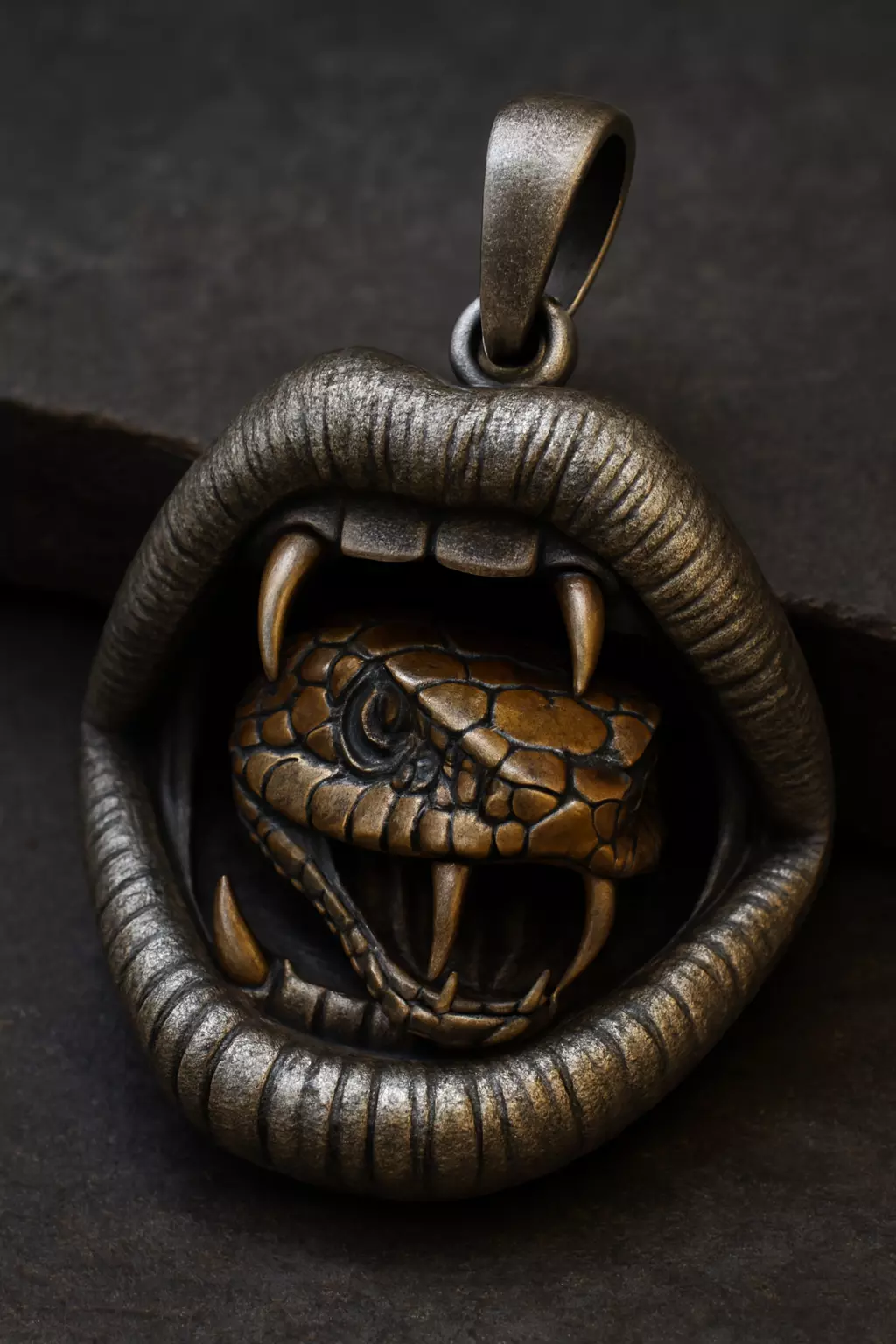 This intricately sculpted pendant depicts a coiled viper emerging from a fanged human mouth, capturing the raw energy of a predator in mid-strike. The design features hyper-realistic lip textures and detailed snake scales that transition beautifully into deep recessed shadows. Engineered for premium jewelry production, this piece is designed to maximize the antique look once cast and oxidized.