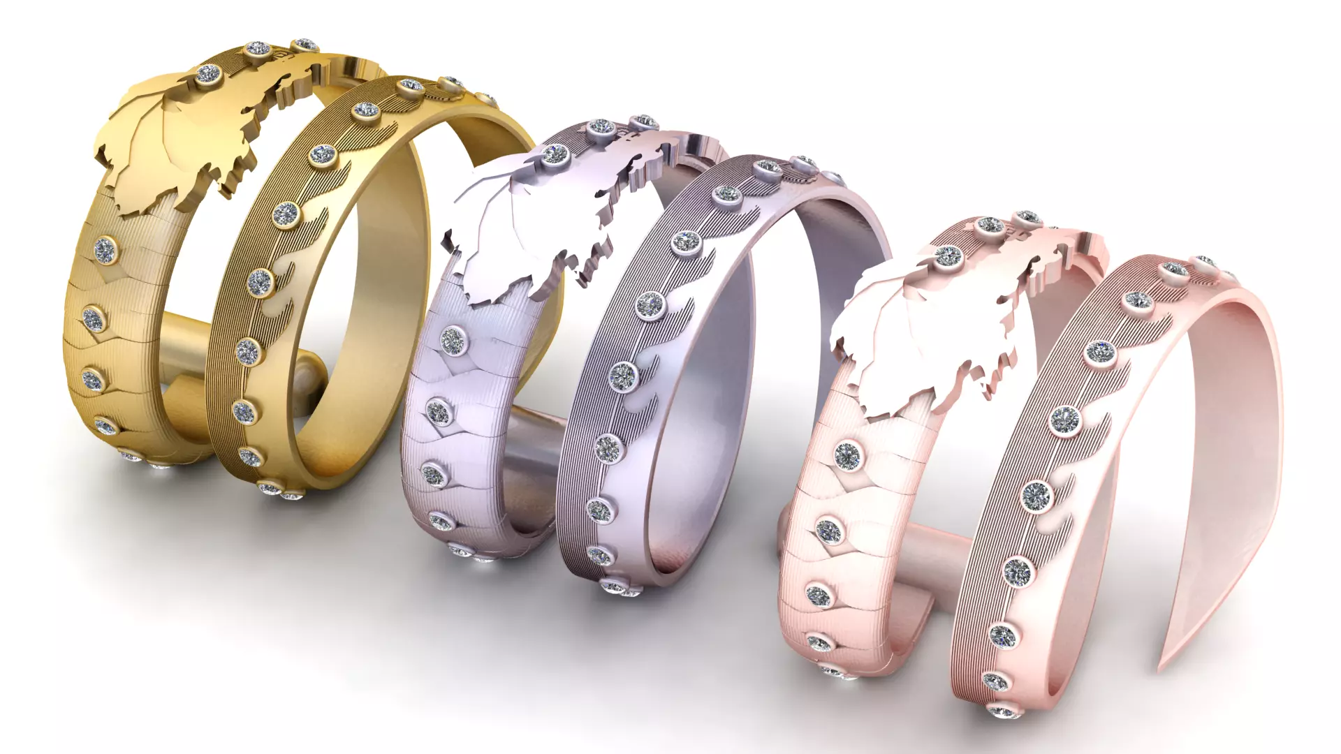 The rings feature a wide band design, intricately carved or textured to represent a map of the world, possibly emphasizing continents or landmasses. Embedded within the map contours are multiple small, round-cut gemstones, likely diamonds or cubic zirconia, adding sparkle and visual interest. The collection showcases variations in metallic finishes, including what appears to be gold, silver/platinum, and rose gold tones, suggesting different material options or aesthetic choices for the same core design. The smooth, polished interior of the rings contrasts with the detailed exterior, highlighting the craftsmanship.