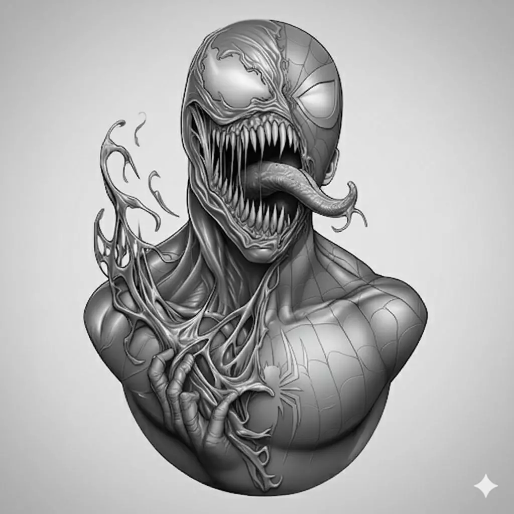 This Symbiote Monster Bust 3D model features a dark, aggressive character with a wide open jaw, sharp teeth, extended tongue, and organic flowing textures across the body. The sculpt has a powerful horror and street-style aesthetic, making it a perfect choice for bold hip hop jewelry and statement pendants.