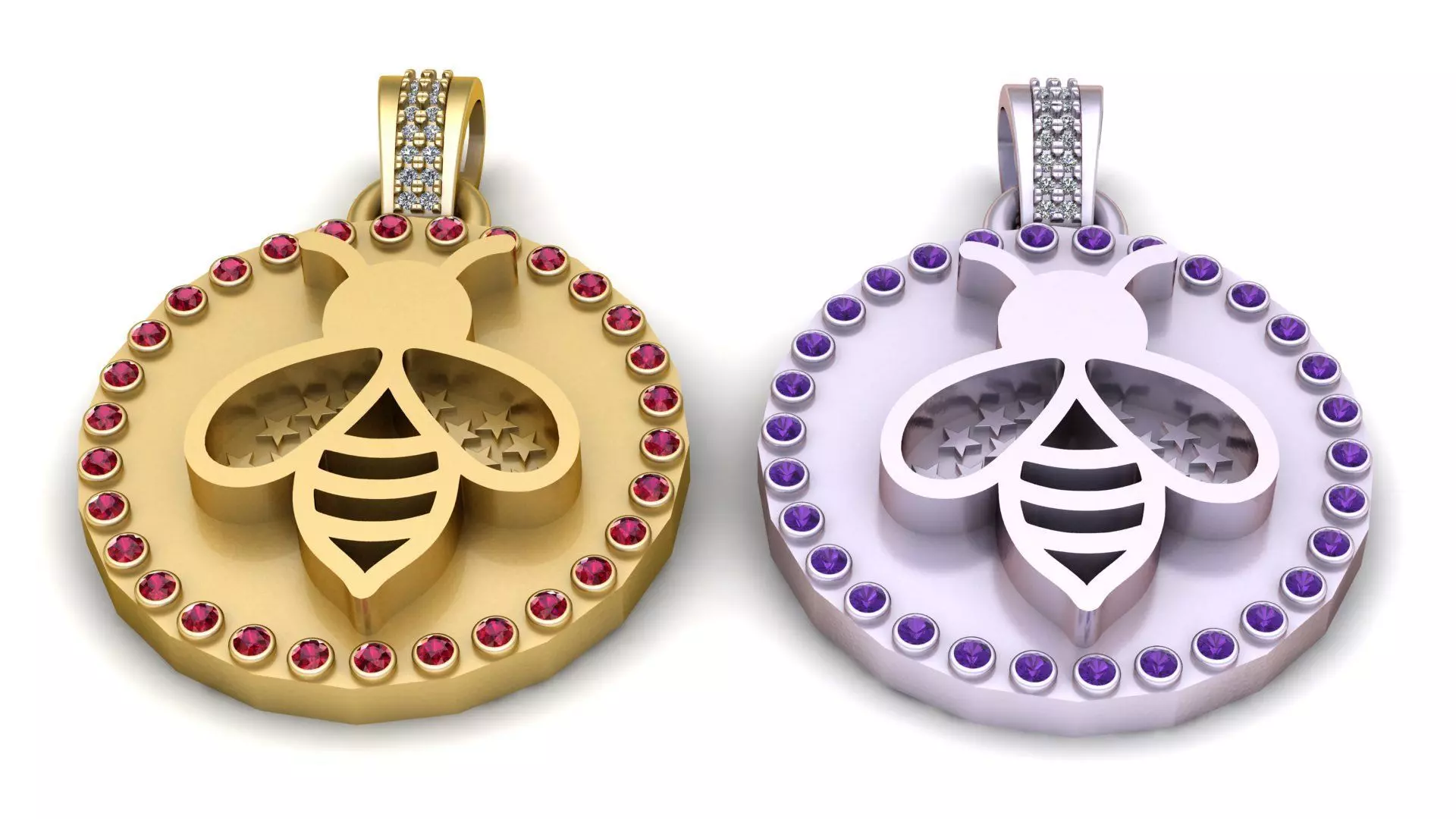 This elegant gold bee pendant beautifully combines symbolism and luxury. The pendant features a bold cut-out bee design at its center, symbolizing hard work, prosperity, and harmony. The round medallion is encircled with sparkling red ruby gemstones, creating a striking contrast with the warm golden finish. The bail is further adorned with brilliant diamonds, adding extra sparkle and refinement.