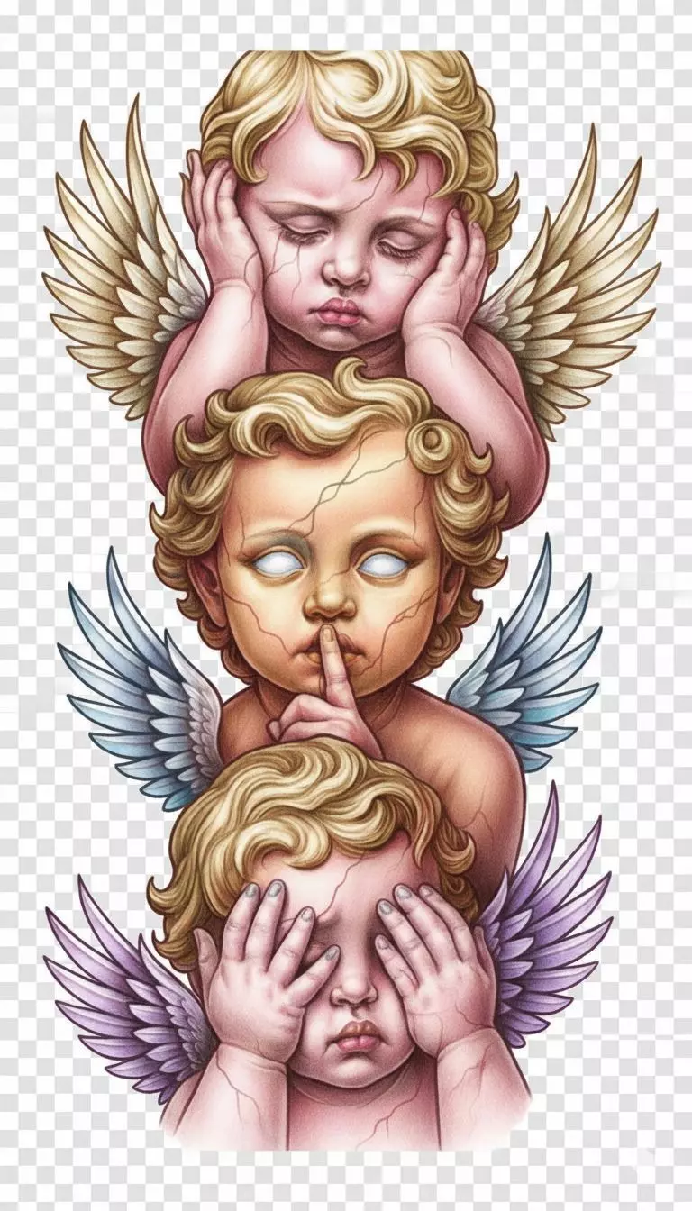 This highly detailed 3D sculpture features three classical cherubs arranged vertically, representing the timeless concept of see no evil hear no evil speak no evil. Each cherub is portrayed with expressive gestures and finely sculpted angel wings, inspired by classical stone and marble statuary. Subtle surface cracks and soft facial details enhance the realistic sculptural aesthetic, making this model ideal for artistic, decorative, and symbolic projects.