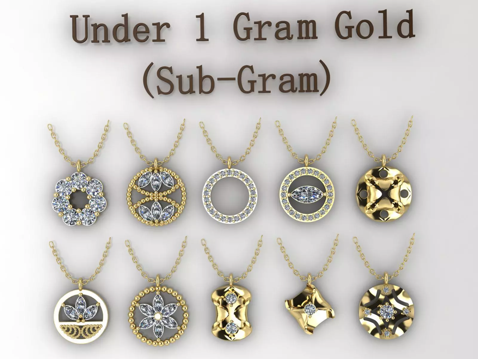 “This sub-Gram or Under 1 gram Gold Jewelry Pendant set Collection includes 10 delicate mini pendants designed for lightweight, elegant jewelry pieces that each Model wheighted under 1 gr 18ky Gold.
