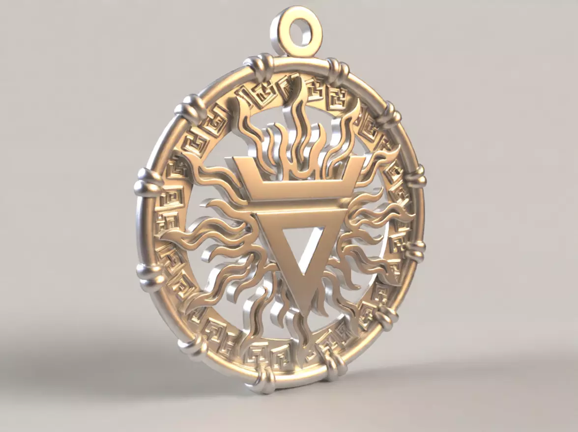 Encircled by ornamental motifs and dynamic flame-like rays, the design evokes primal energy and ancient symbolism. The open structure ensures a balanced weight and excellent castability, making the piece suitable for precious metals and everyday wear.