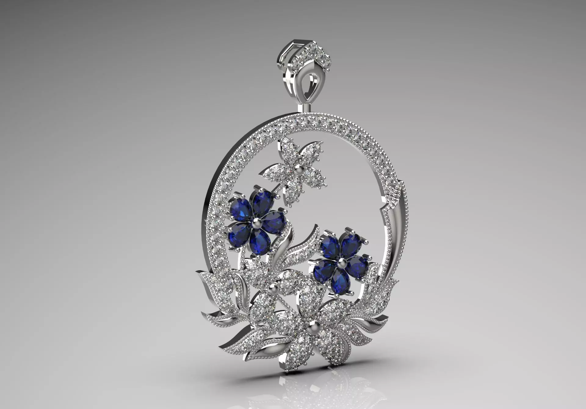 This pendant features a beautiful floral design in a circular frame made of shiny gold metal. It showcases several distinct flowers, mostly adorned with blue gemstones that are sapphires. The stones are shaped like petals that add a rich color contrast against the smaller, sparkling clear stones that adorn the surrounding areas.