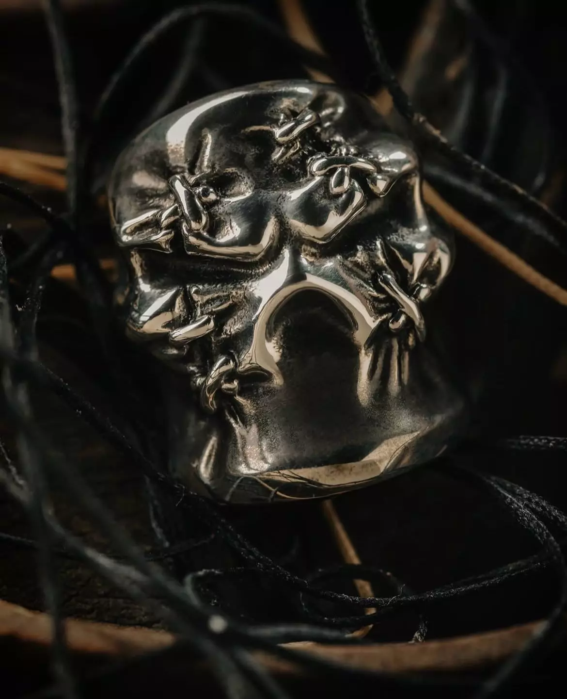 This Sutured Skull Ring breaks the conventional aesthetics of traditional jewelry with its highly impactful design language, perfectly blending dark style with craftsmanship ingenuity. The main body of the ring centers around the skull shape, crafted from sturdy materials such as alloy, silver, or titanium steel. Through precision casting or CNC carving techniques, it highly restores the anatomical details of the skull. The rugged bone surface, sunken eye sockets, and nasal cavity vividly create a cold and mysterious atmosphere.