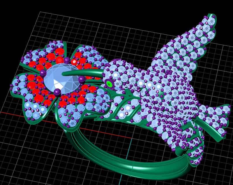 This image also features a hummingbird, but this time the bird is shown feeding from a more ornate flower. The hummingbird and the flower are both decorated with numerous gemstones, with various shades of purple, green, and light blue.The flower in this design has larger, more prominent petals with red and light blue gemstones, while the hummingbird is similarly adorned with sparkling gems over its entire body and wings, offering a rich, textured appearance.Both designs show a high level of artistry and are likely custom jewelry pieces, capturing the essence of nature with the hummingbird in flight, interacting with flowers. The multicolored gems suggest a vibrant, intricate final product.**
