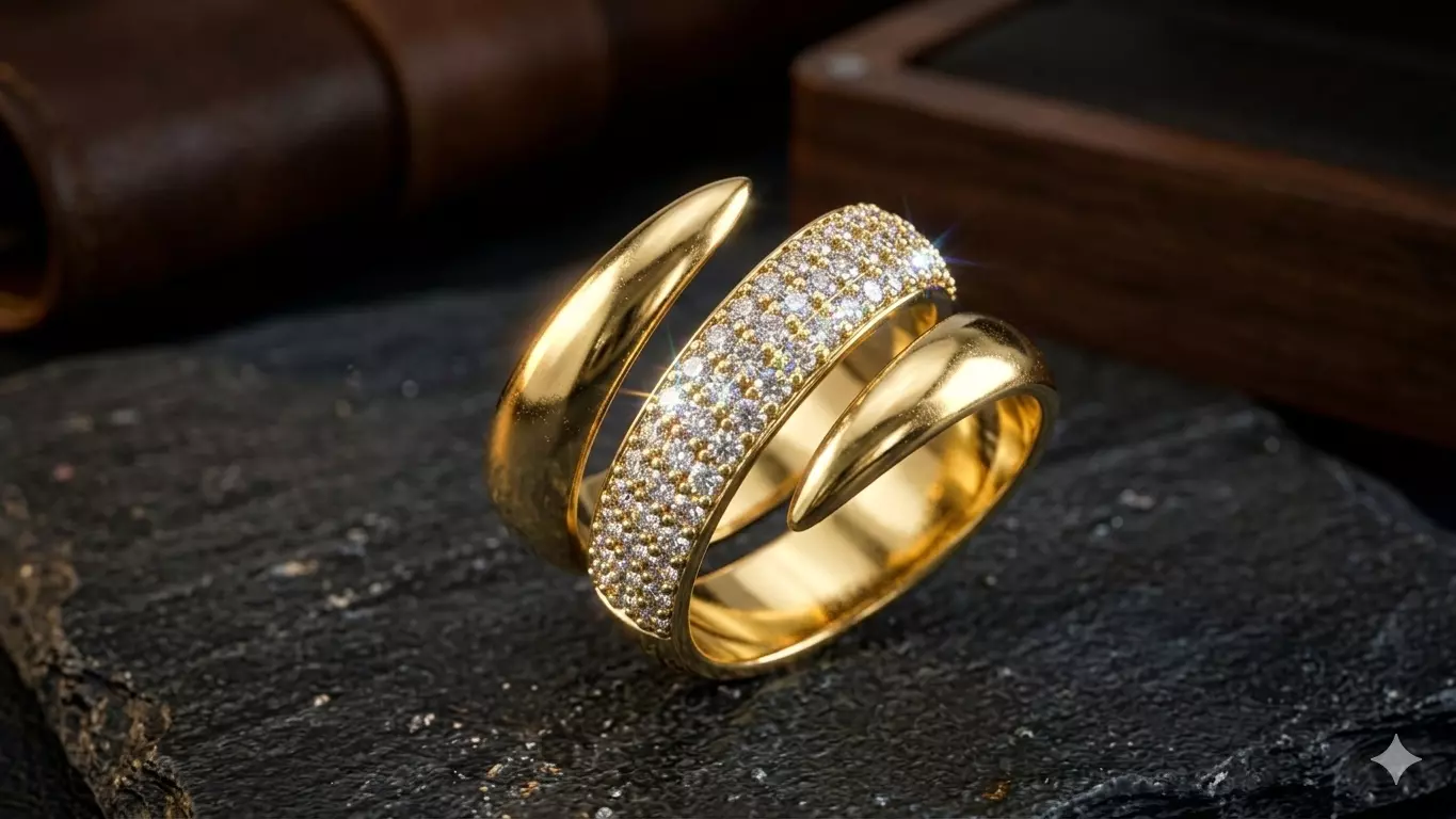 "Presenting a highly detailed, production-ready 3D CAD model of an elegant 3-row spiral wrap ring, featuring a stunning pave-set diamond center band flanked by smooth, polished outer bands. This modern, sleek design is perfect for yellow gold, white gold, rose gold, or platinum casting.