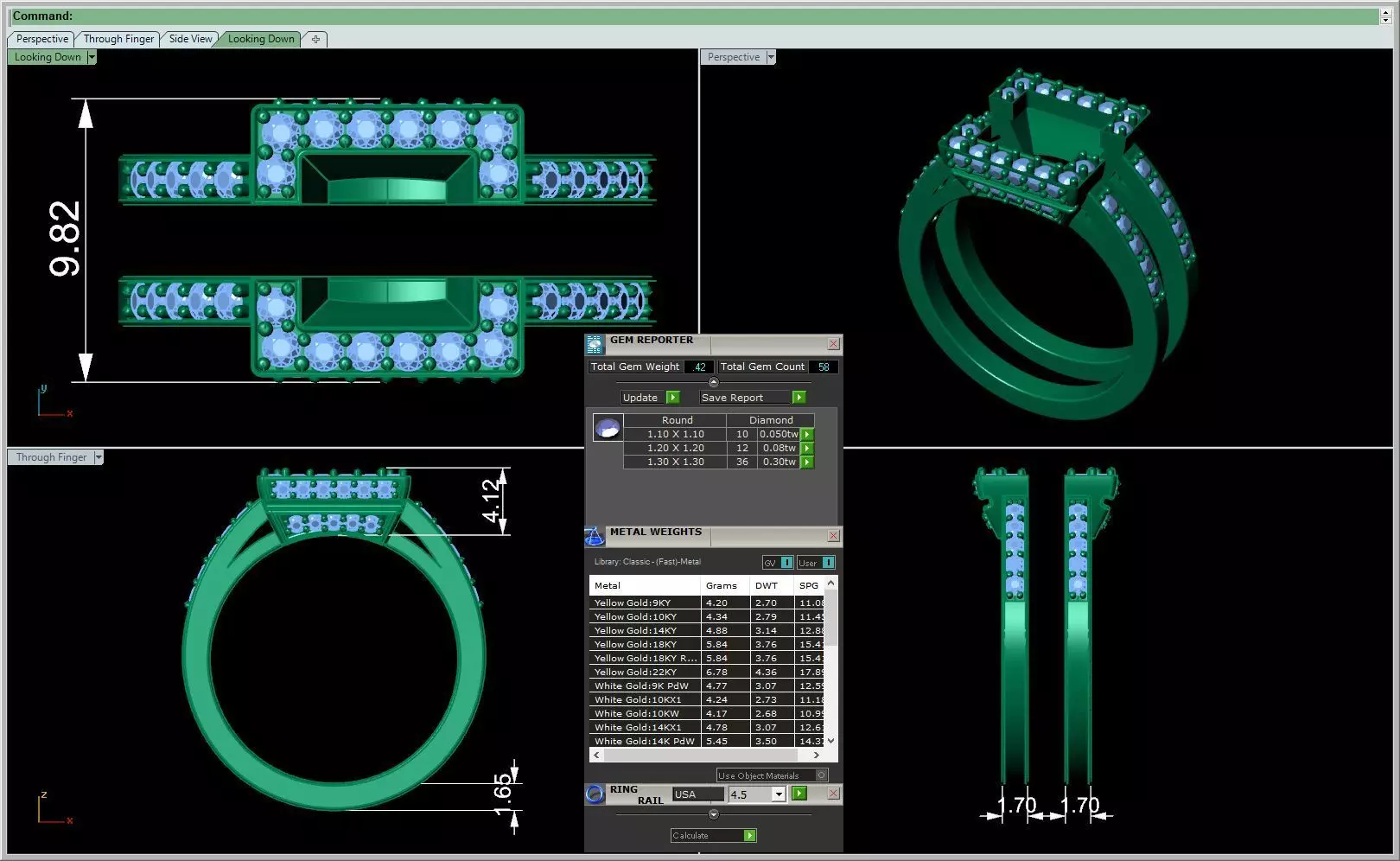Ring Size Gold Metal Weight in dfferent Karats like 14k, 18k, 22k Gem Stone weight ( Carat Weight ) for all stones in the Model also Quantity of Stones. Dimensions of the Model in mm (millimeter) unit. Delivery Contains 11 files as following :