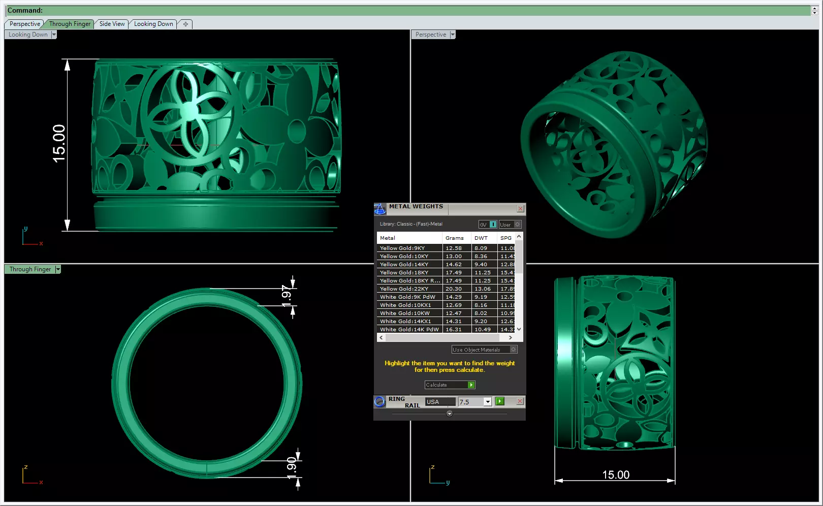 Ring Size Gold Metal Weight in dfferent Karats like 14k, 18k, 22k Gem Stone weight ( Carat Weight ) for all stones in the Model also Quantity of Stones. Dimensions of the Model in mm (millimeter) unit. Delivery Contains 11 files as following :