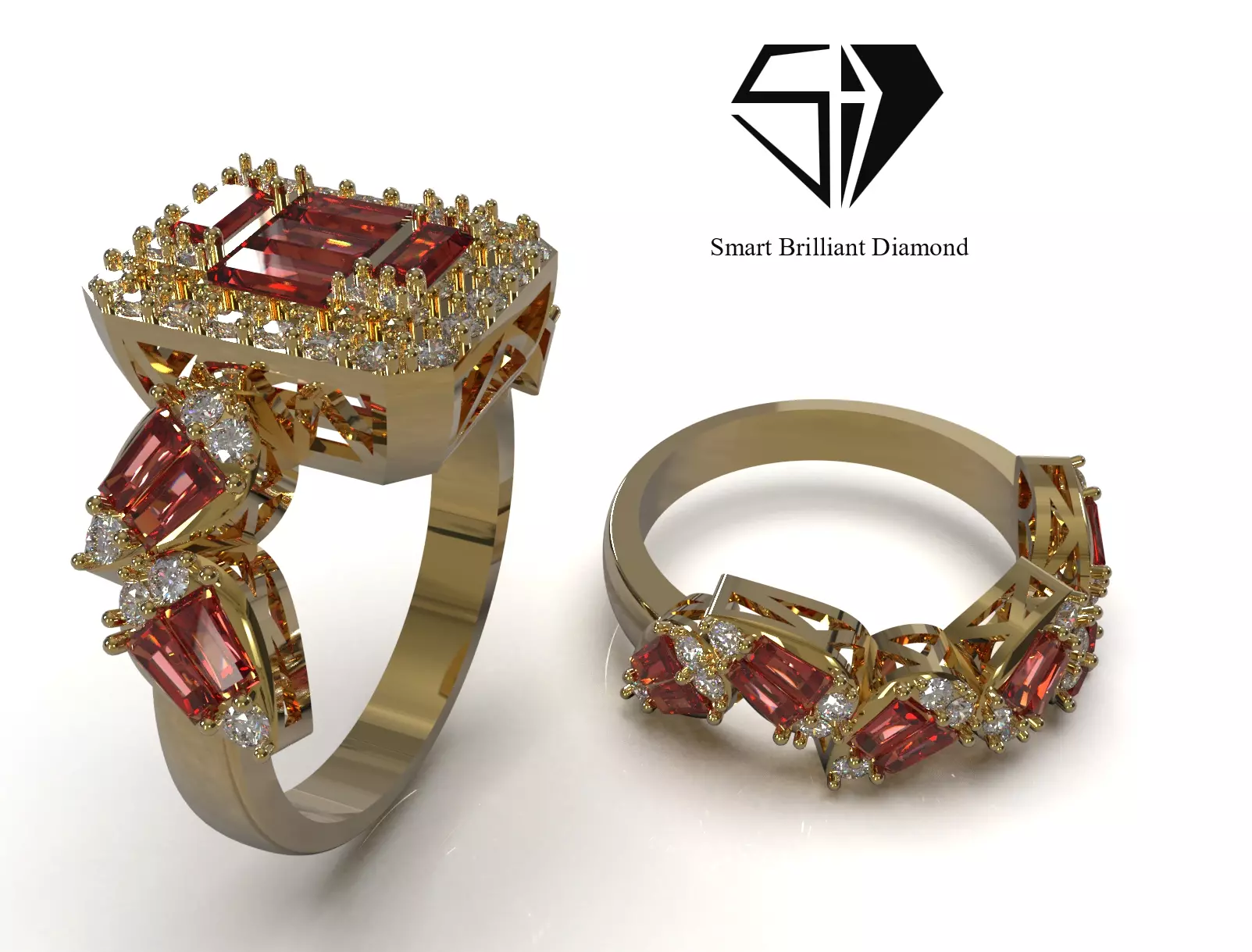 Design Highlights:- Halo Ring: Features a large rectangular panel in the center surrounded by a combination of red stones (red ruby design) with emerald cut (Emerald Cut) and tiny diamonds.