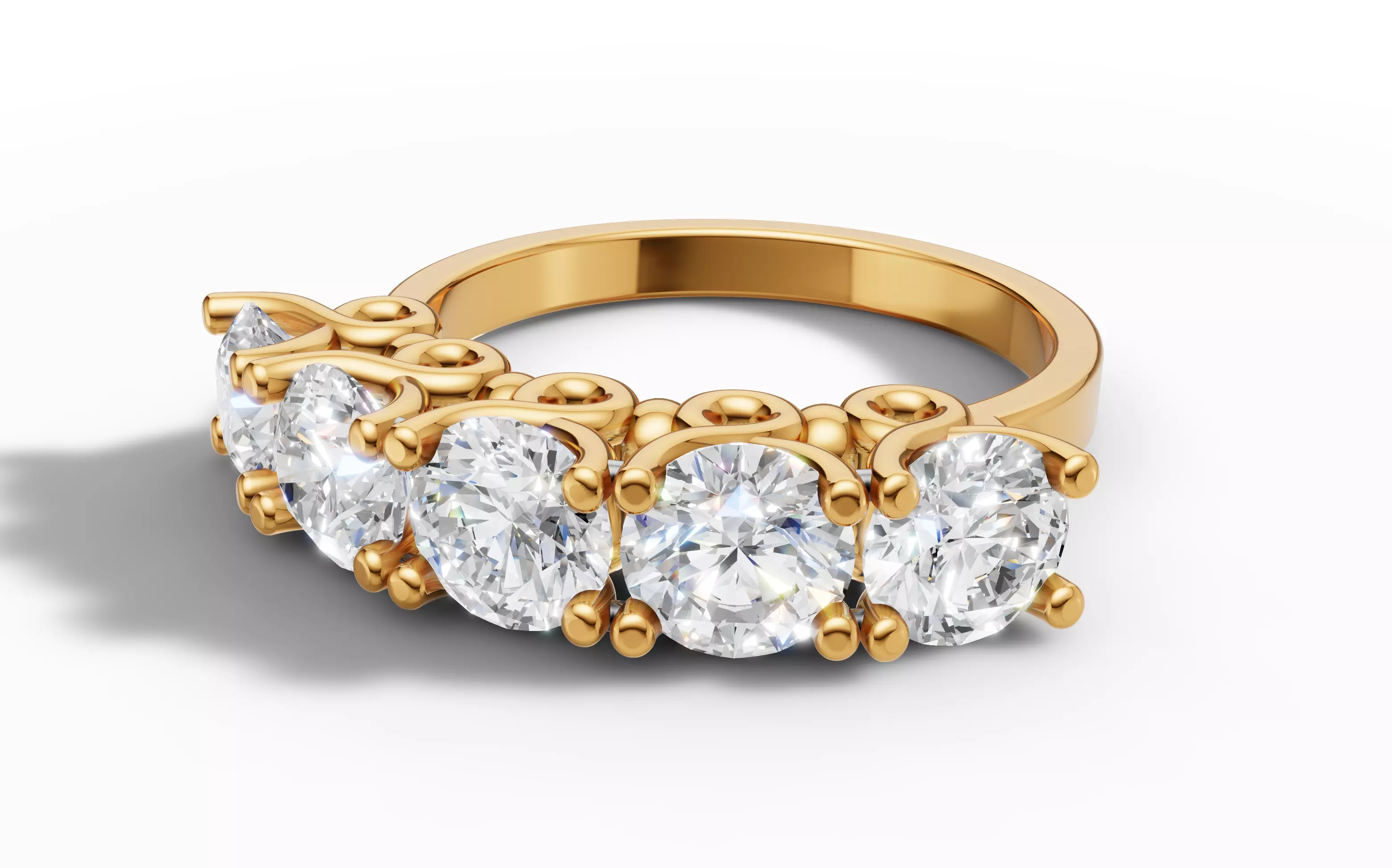 5 gemstones total: 2.34ct weight featuring Five large round sapphires (5mm)Metal weight: 4.03g to 6.51g (9K-22K yellow/white gold)Classic Five stone design with prong-set center and side stonesDecorative gallery with intricate openwork and bead accentsElegant split shank with flowing curves and artistic detailsPerfect for: Engagement rings, anniversary gifts, bridal jewelry, luxury collections