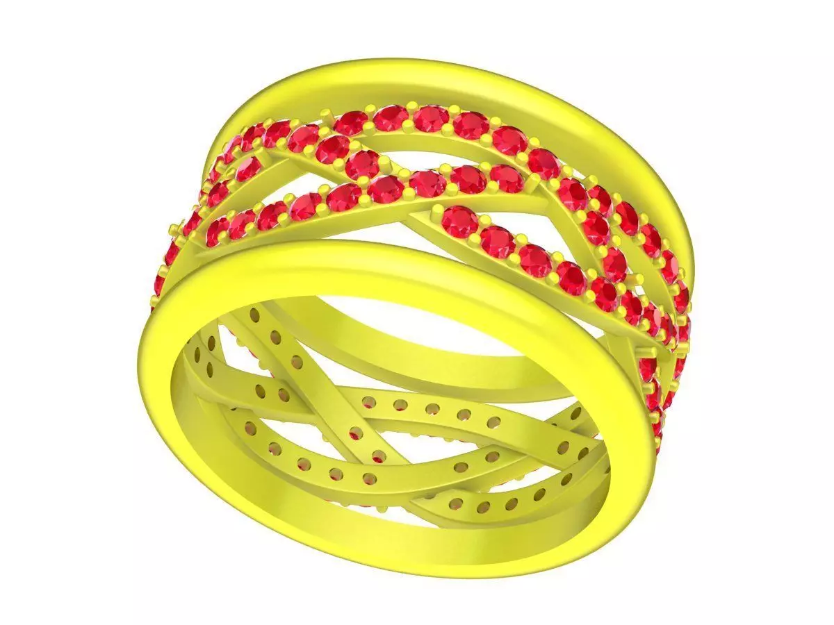 This 3D jewelry model features a luxurious interlaced band ring design for women, characterized by multiple crossing rows of round gemstones. The intertwined structure creates a dynamic and elegant visual effect, symbolizing connection and harmony.