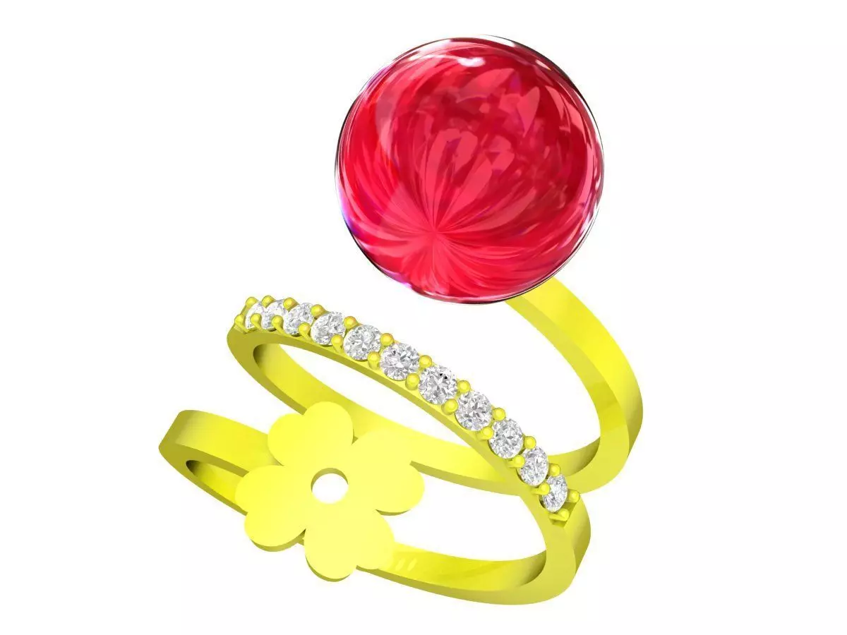 This 3D jewelry model features a luxury floral open band ring designed with a playful yet elegant aesthetic. The centerpiece is a round gemstone set in a raised position, creating a clear focal point and enhancing light reflection from multiple angles.