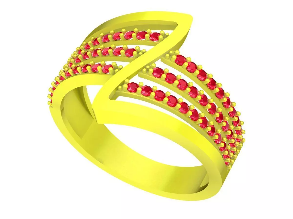 This elegant curved ring features a modern Z-shaped structure combined with multiple parallel rows of round red gemstone settings. The layered design creates depth and visual movement while maintaining a balanced and comfortable ring profile.