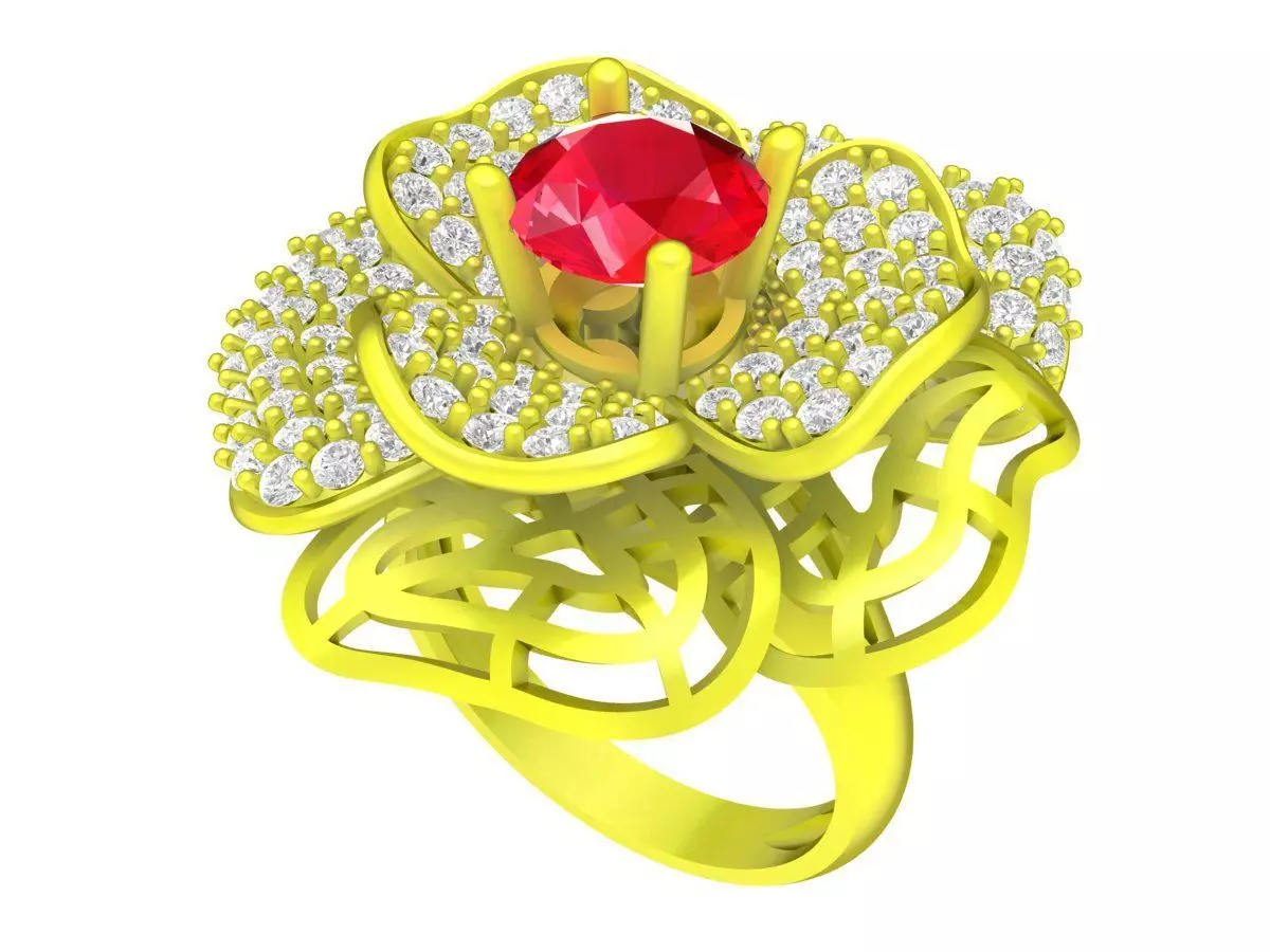 The openwork floral construction allows light to pass through the setting, creating strong visual sparkle while keeping the overall metal weight optimized for comfortable wear. The sculptural petal design adds volume and luxury appeal, making this ring suitable for statement jewelry collections.