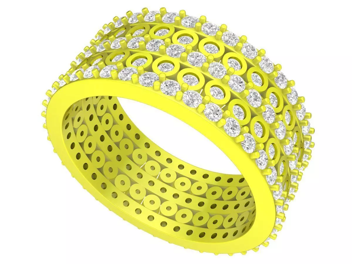 This wide pavé circle pattern band ring 3D model features a bold and luxurious design with multiple rows of pavé-set stones combined with circular openwork details across the band. The repeating round cutout pattern creates depth, airflow, and a distinctive visual rhythm while maintaining a solid and balanced structure.