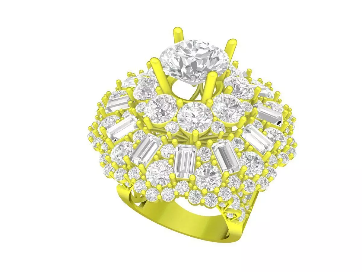 The elevated crown setting enhances light reflection while creating a strong visual presence and depth. The wide band is carefully engineered to support the complex stone arrangement, ensuring durability, balance, and comfortable wear. This professional 3D jewelry model is optimized for precise stone placement and reliable production standards.