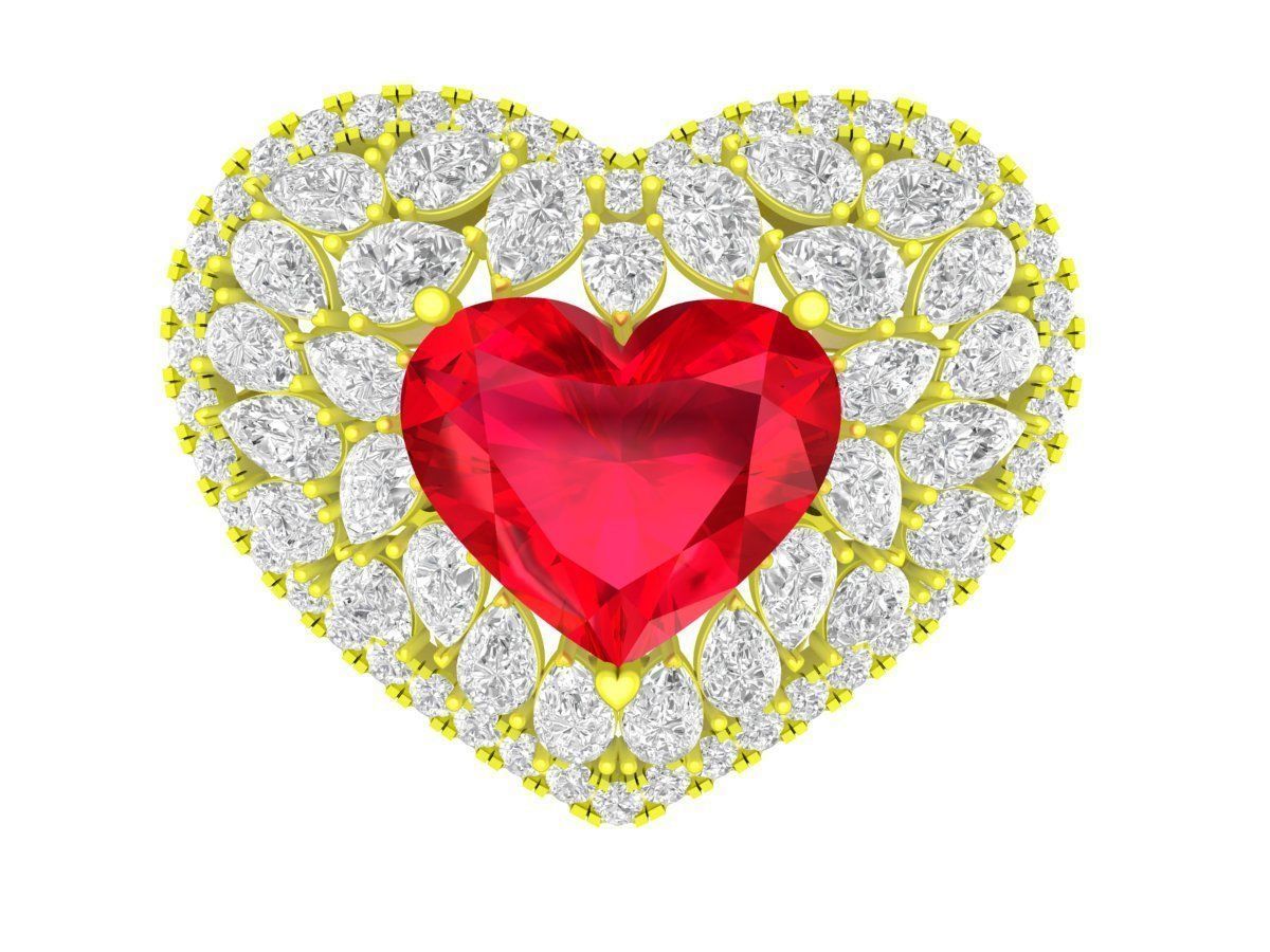 This is a professional 3D jewelry model of a luxury heart-shaped ring featuring a vivid red heart-cut center stone surrounded by multiple layers of pavé diamonds. The romantic heart design is enhanced by precisely arranged round and marquise-shaped diamonds, creating exceptional brilliance and visual depth.