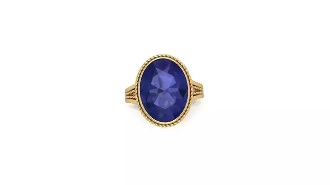 The ring's shank, or band, is crafted from a warm, lustrous yellow gold, a metal that complements the sapphire's cool blue tones beautifully. The gold's rich hue adds a touch of opulence and grandeur, enhancing the ring's overall appeal. The shank features a split design, with each side intricately woven or braided, echoing the rope detailing on the bezel. This intricate design element adds depth and visual interest to the ring, making it a conversation starter.