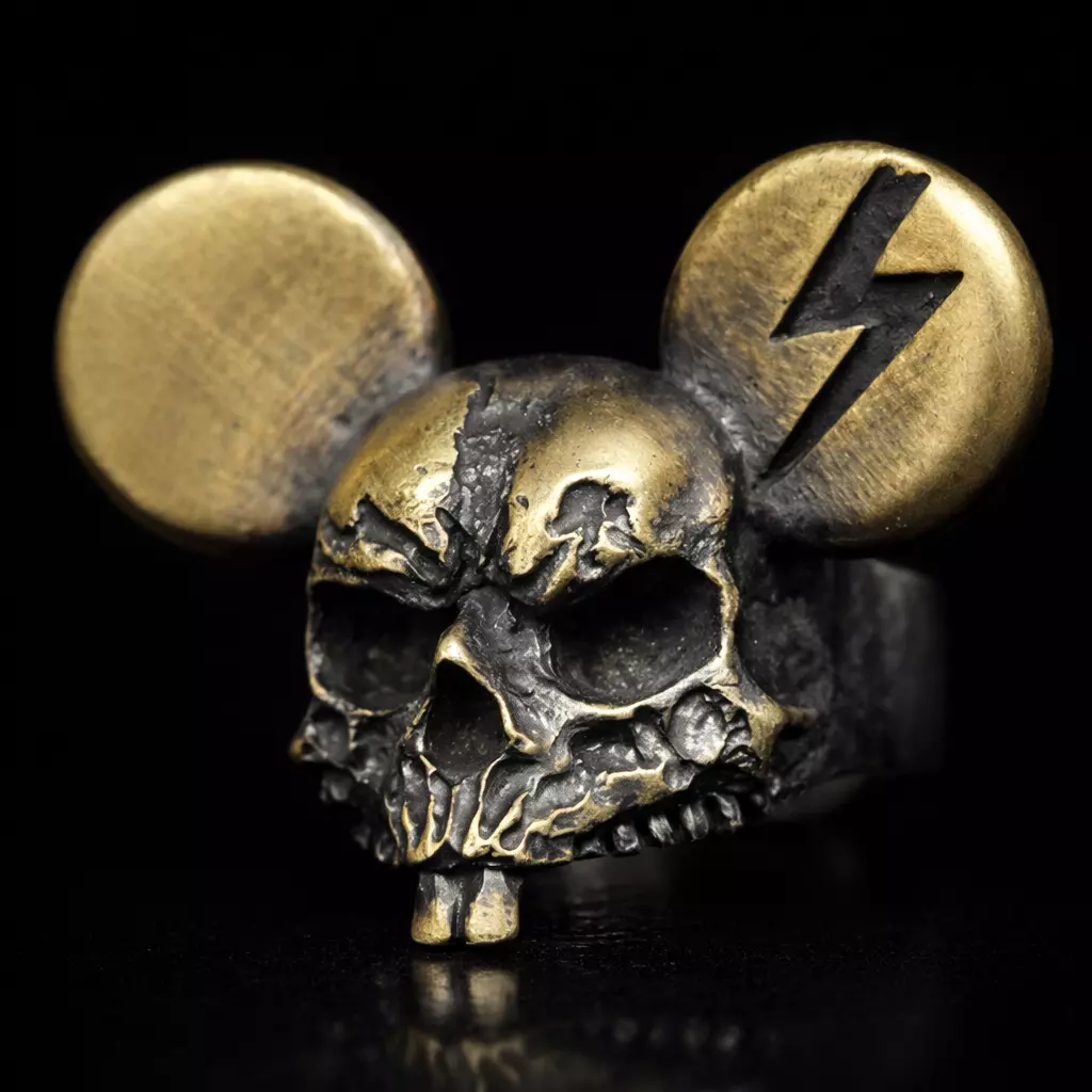 Defy convention with this provocative Electric Rodent skull ring. Merging pop-culture silhouettes with a gritty, post-apocalyptic finish, this piece features a distressed animal skull with oversized, coin-like ears—one of which is engraved with a bold lightning bolt strike. The heavily textured, weathered surface gives it an unearthed, ancient artifact feel while maintaining a rebellious punk edge. It's a high-impact cocktail ring designed for the boldest of style icons.
