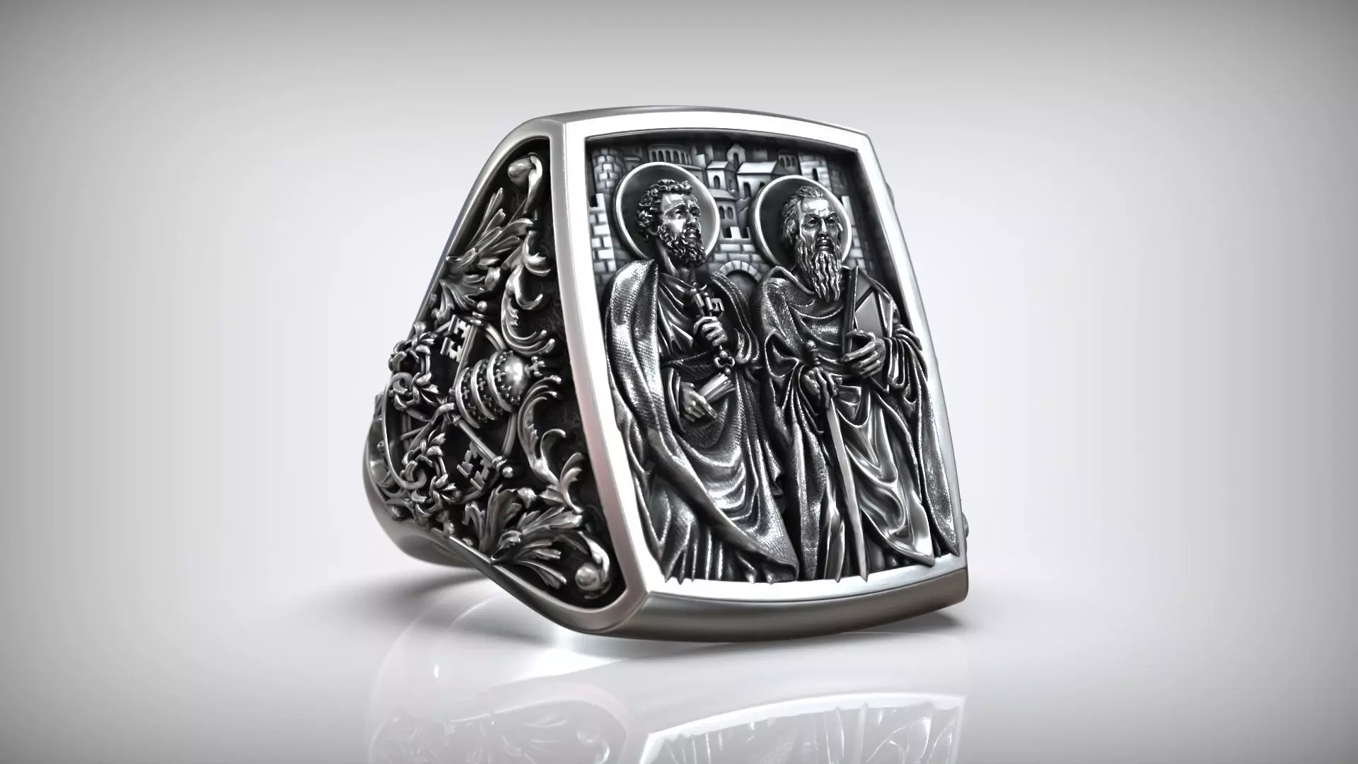 This finely detailed 3D model of a signet ring features a high-relief depiction of Saints Peter and Paul, the two most revered apostles in Christian tradition. The central panel portrays them standing together against an architectural backdrop, symbolizing the unity of faith and mission.