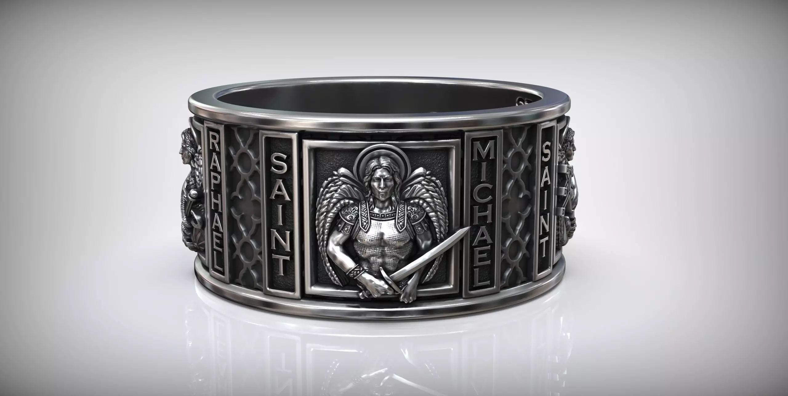 This exquisite 3D model of a ring is designed with deep spiritual meaning, featuring detailed bas-relief depictions of the Four Archangels on its outer surface. Each Archangel – St. Michael, St. Gabriel, St. Raphael, and St. Uriel – is meticulously sculpted with symbolic elements representing their divine attributes.