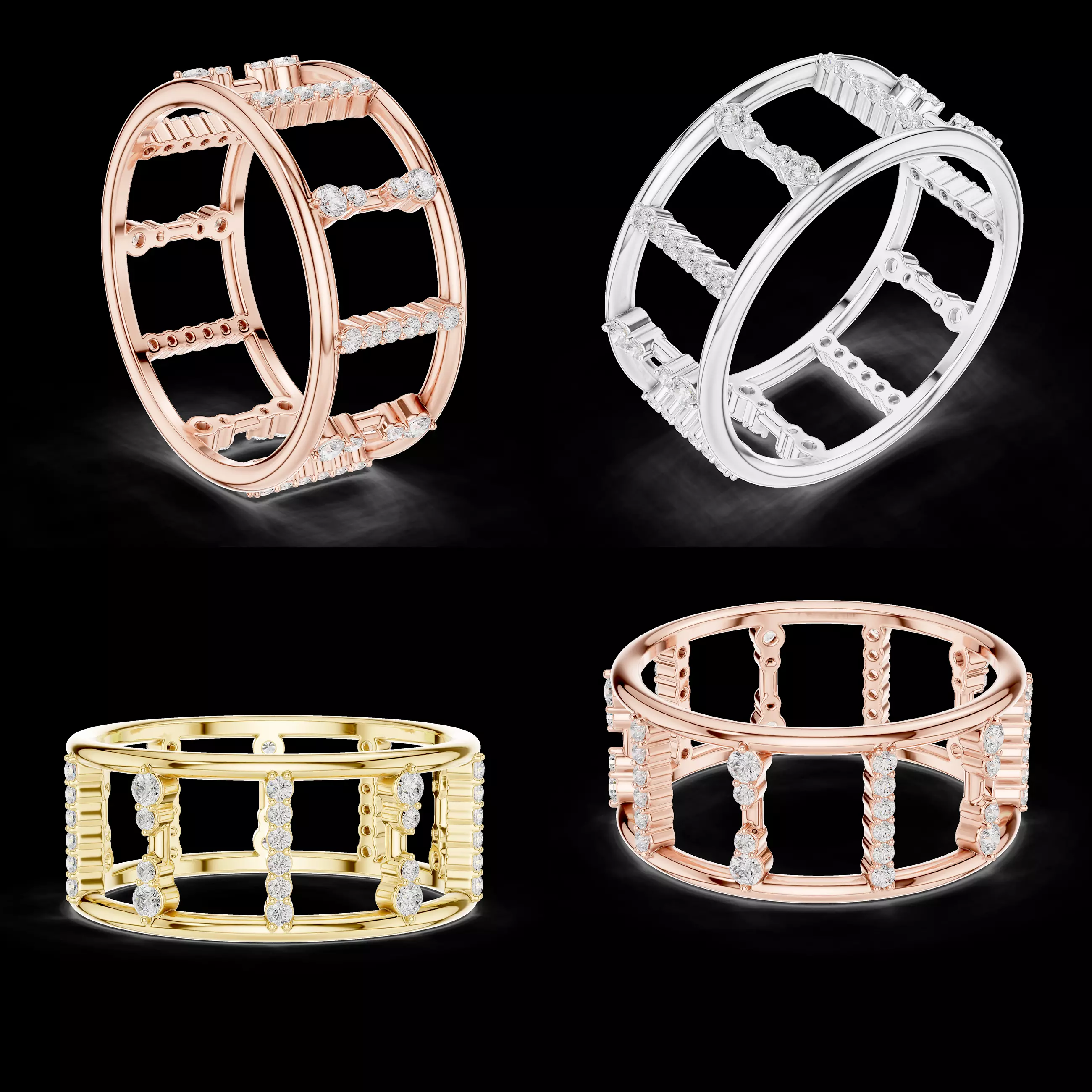 Ring Style: Wide band statement ringDesign Type: Open grid architecturalStructure: Multi-bar vertical frameworkBand Profile: Bold and symmetricalSurface Finish: High polishCAD Scale: Real jewellery scaleModel Status: Production ready