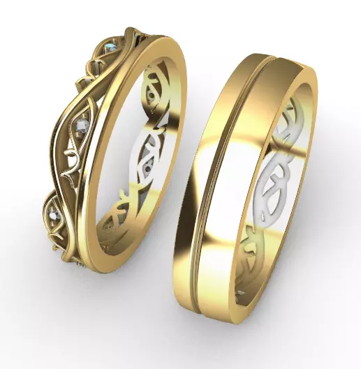 Argollas de matrimonio: la argolla de dama cuenta con 8 diamantes (o esmeraldas). La argolla de caballero cuenta con un grabado interno, similar a la forma de la argolla de dama.