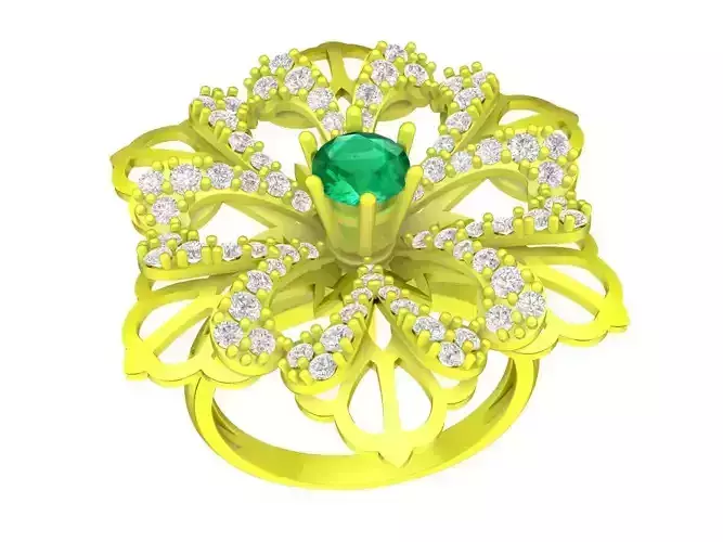 This 3D jewelry model showcases a luxurious floral ring design created with multiple petal layers and a prominent center gemstone. The openwork structure forms an elegant flower motif, enhancing light reflection while maintaining a refined and feminine appearance.