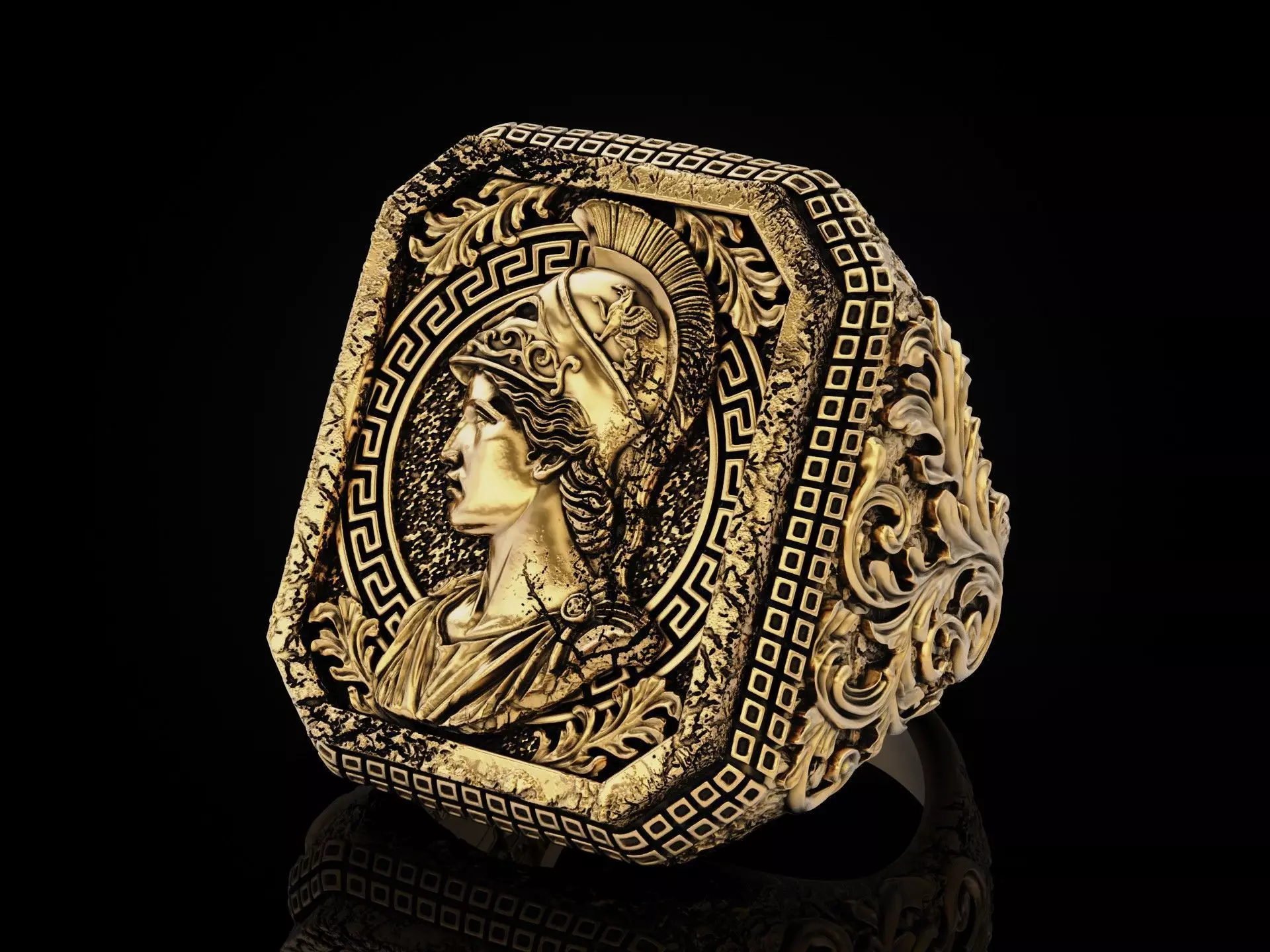 This exquisite signet ring features a detailed profile of the Greek goddess Athena, depicted in her iconic helmet. The design is framed by a traditional Greek key meander border and lush acanthus leaf scrolls, all set against a unique aged ruinist texture that evokes the feel of ancient archaeological finds. This model is fully print-ready and optimized for high-quality jewelry casting. The deep relief and intentional ruined textures are designed to capture every detail in metal, making it an ideal choice for silver with oxidation or gold production.
