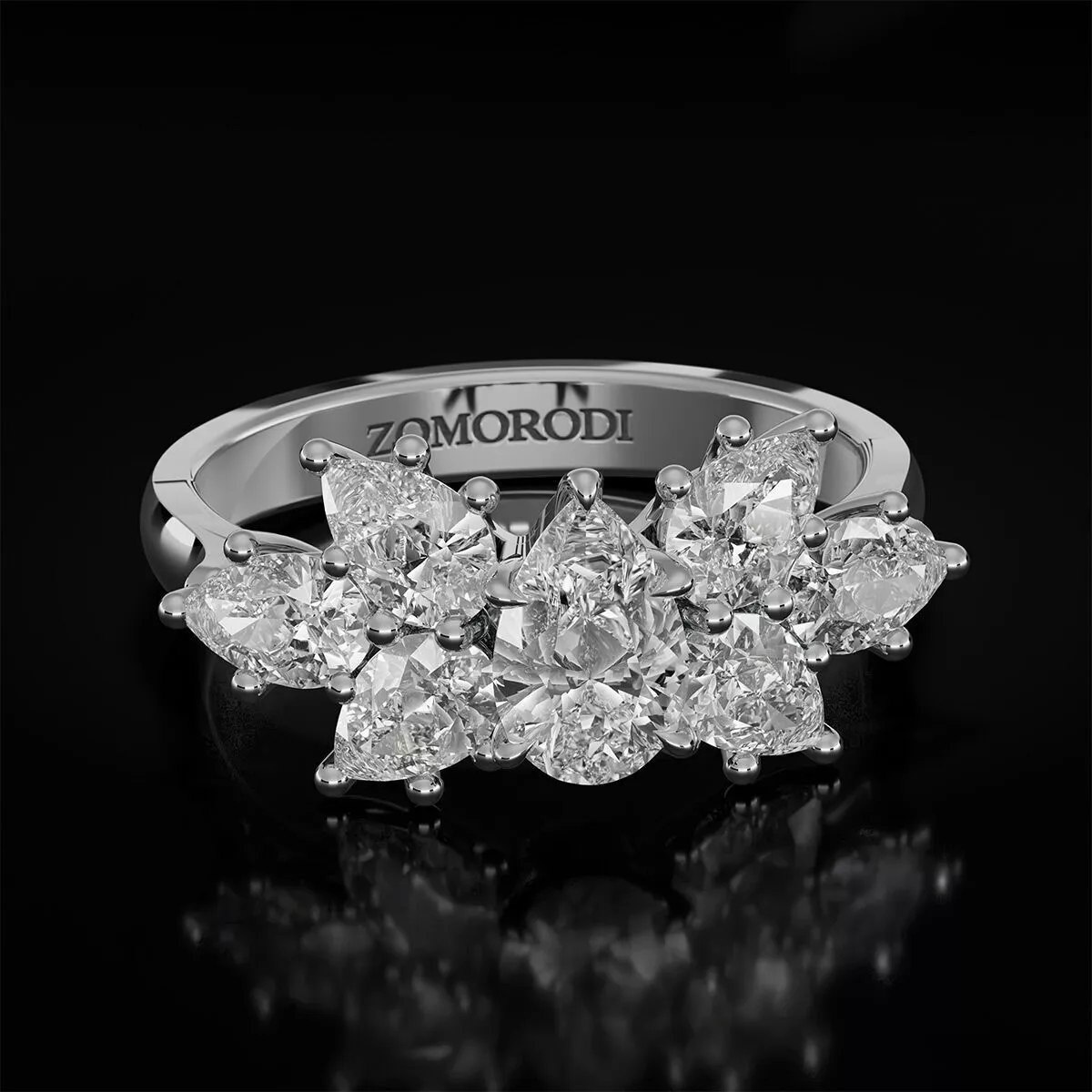 *Stone Details *Total Stones: 7 Diamonds Center Stone: 1 × Pear Cut Diamond Dimensions: 7 × 4.50 × 2.70 mm Surrounding Stones: 6 × Pear Cut Diamonds Dimensions: 5 × 3.2 × 1.9 mm each Setting Style: Multi-prong setting for secure stone placement Layout Concept: Floral-inspired cluster arrangement formed entirely by pear-shaped diamonds Center stone acts as the focal point, with surrounding pears creating a petal-like composition Visual Effect: High brilliance with elongated light reflection Enhanced finger coverage due to pear orientation Elegant directional flow that elongates the appearance of the finger