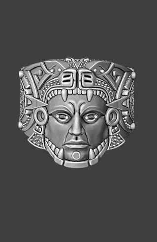 Jaguar Warrior (Ocelotl): The ring depicts a warrior in traditional attire, with his face framed by the open mouth of a jaguar. The Jaguar Warriors were members of one of the most elite military units of the Aztec empire.