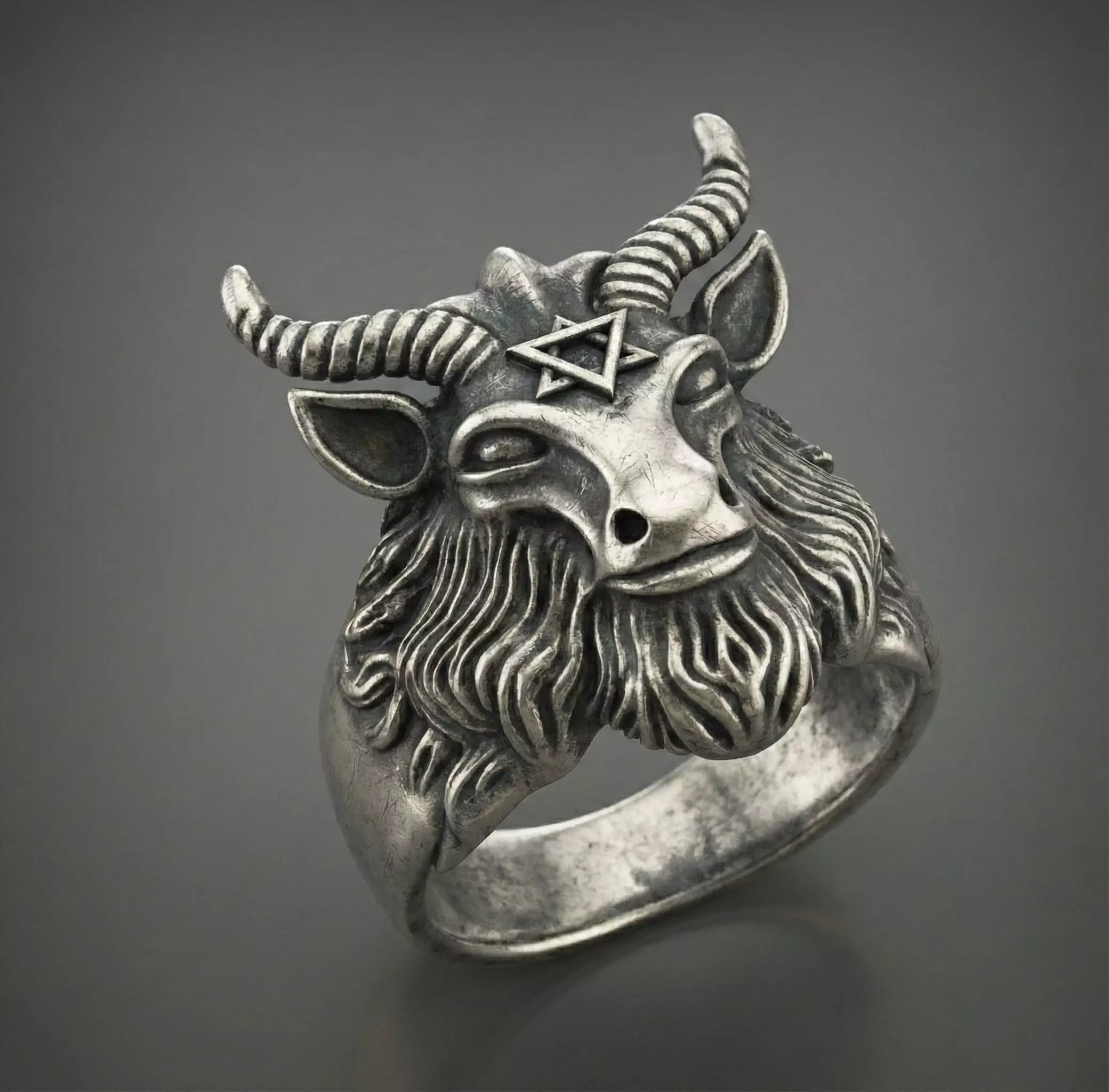 Descripción: Modelo 3D profesional de anillo Baphomet con gran nivel de detalle (textura de pelaje y pentagrama).