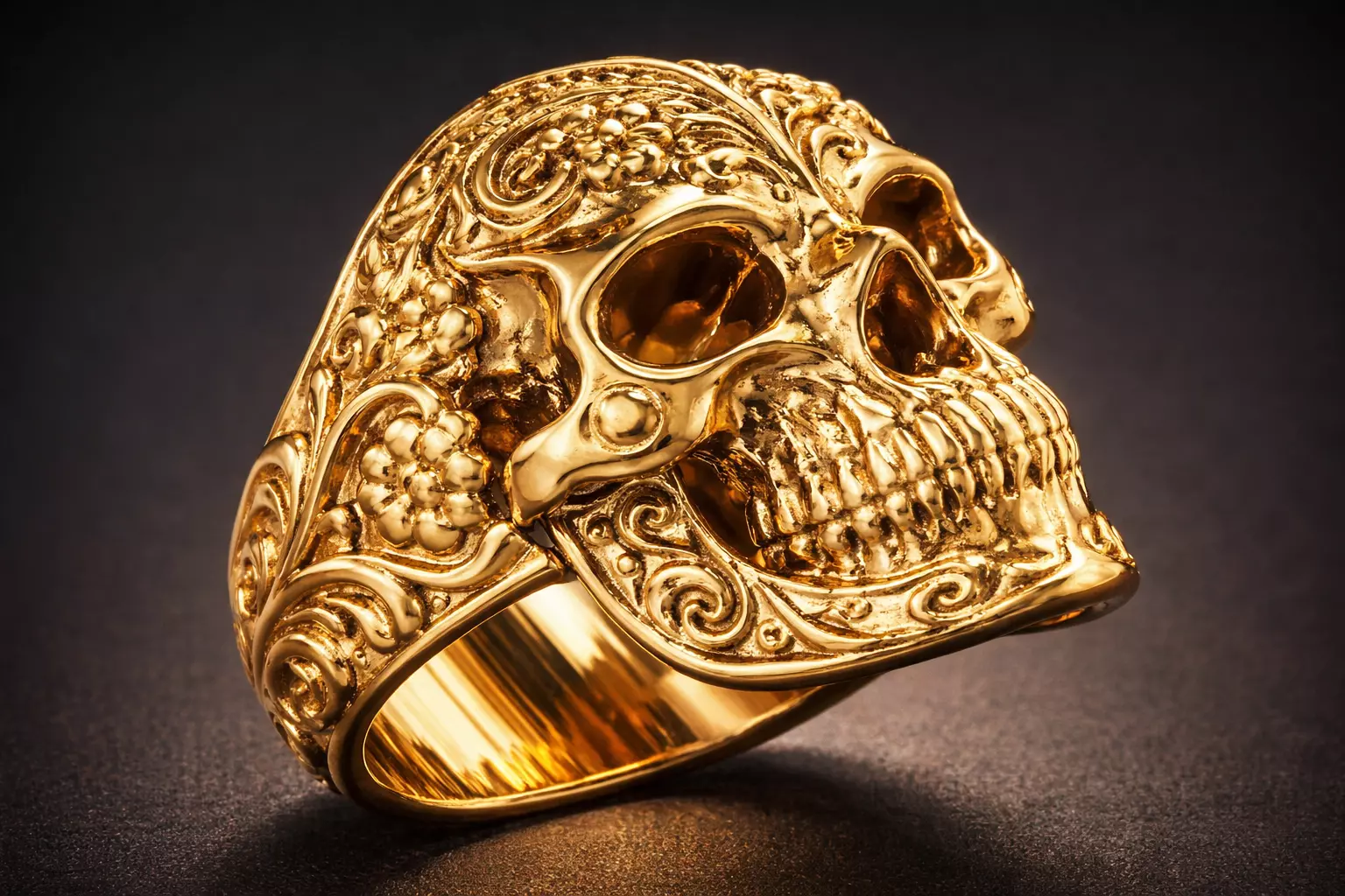 This is a highly detailed ornamental skull ring designed for professional jewelry production. The model features baroque engravings integrated into a sculptural skull form with smooth polished surfaces and balanced structural proportions.