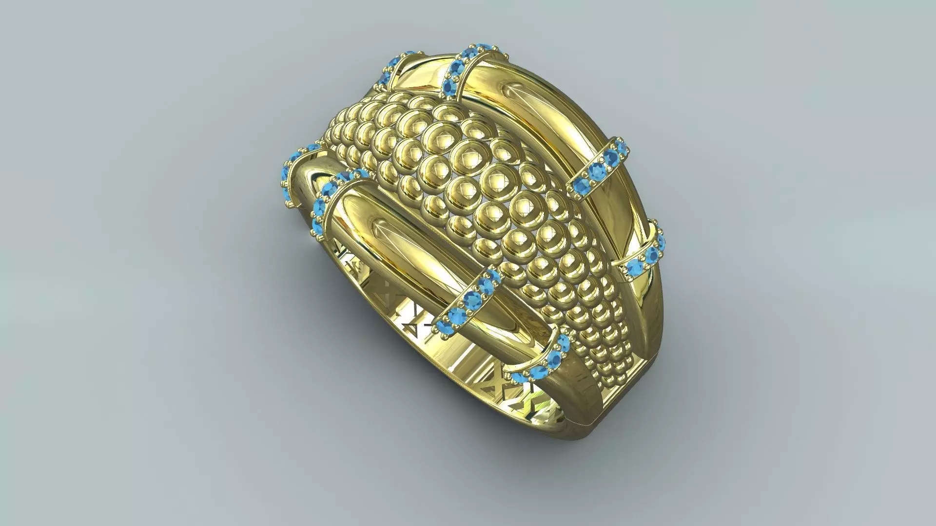 Make a bold impression with this Beaded Dome Statement Ring, a high-impact design that combines classic texture with a striking contemporary silhouette. The centerpiece features an intricate field of polished gold beads, flanked by smooth architectural bands and accented with vibrant blue gemstone rows. This sculptural piece is engineered for precision 3D printing and professional jewelry casting, featuring internal surfaces smoothed for maximum wearer comfort and easy hallmarking. The model is carefully prepared to ensure that the delicate beadwork and pave settings remain crisp through final polishing and is provided in both professional formats for immediate production.