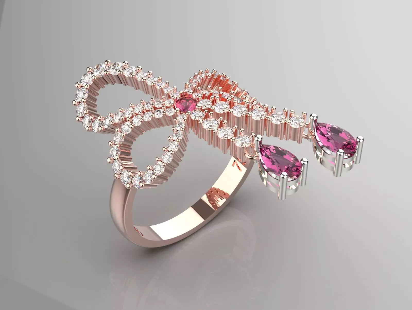 From the ends of the bow extend two pear-shaped pink gemstones, enhancing the overall elegance of the piece. The interplay of the rose gold with the sparkling stones gives the ring a luxurious and sophisticated appearance, making it suitable for special occasions. The background is a soft gray, which highlights the ring's details and brilliance beautifully.