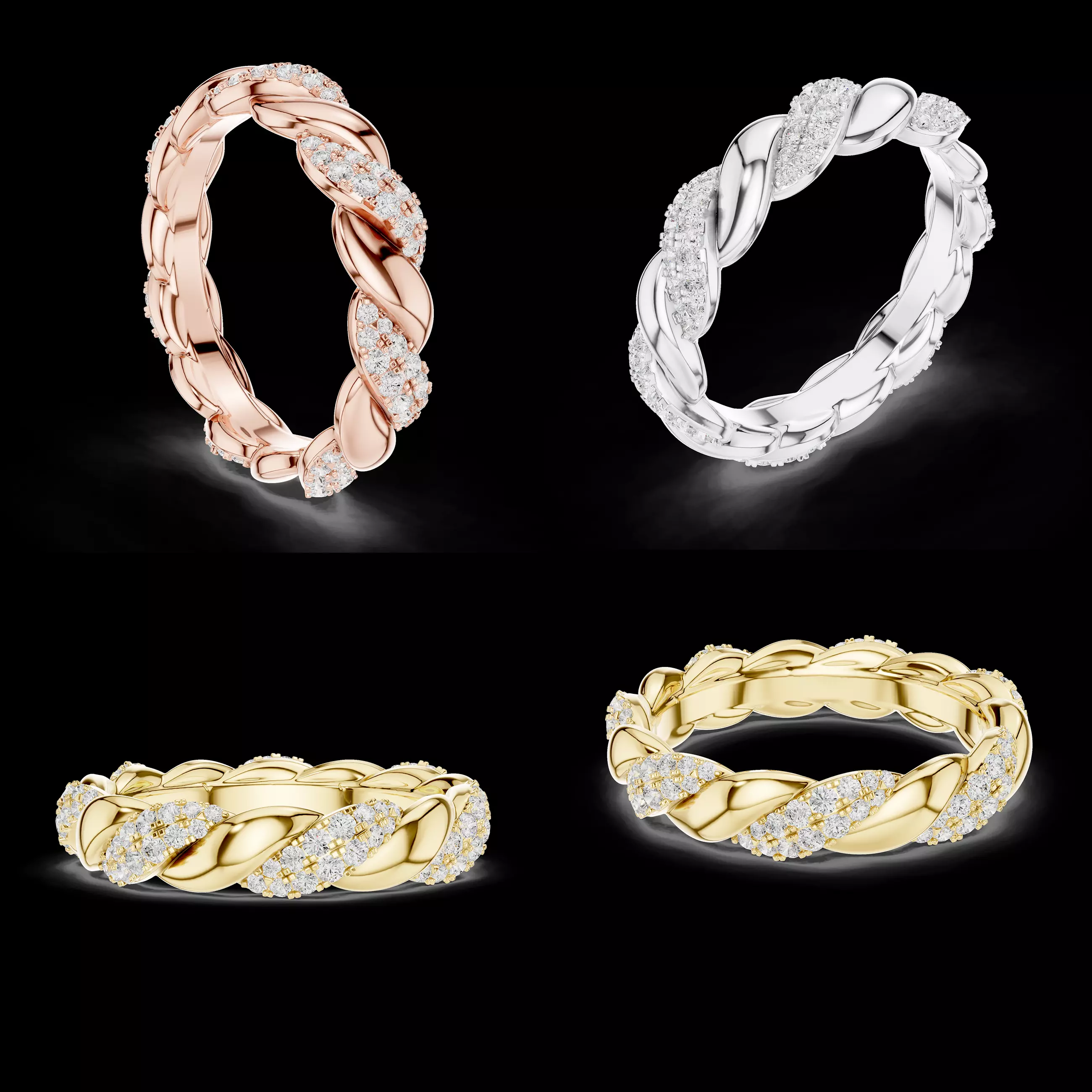 The twisted rope-inspired geometry gives the ring a premium handcrafted appearance while remaining technically optimized for production. Stone placements are evenly distributed across the band to maintain balance, brilliance, and comfort on the finger.