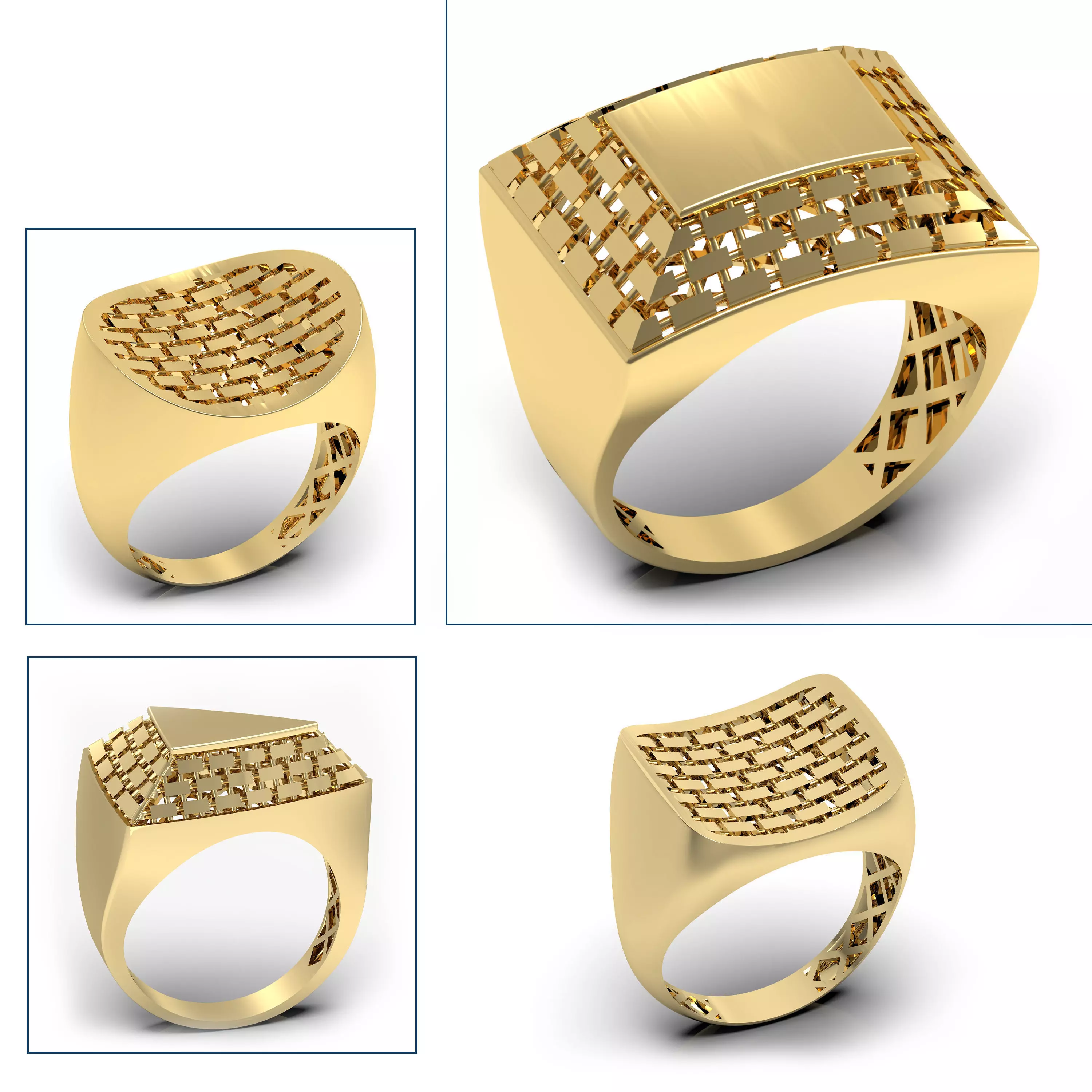 Brick Pattern Women's Ring Collection – Set of 4This collection includes four stone-free women's rings, each featuring a delicate brick-inspired surface pattern in geometric forms: rectangle, oval, triangle, and cushion.The models are bold yet lightweight and minimal, designed for direct casting.Ring size: EU 56Ring size: US 7.5Average weight: 5 g eachShell thickness: 0.4 mm