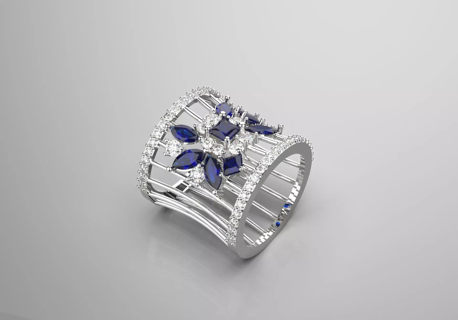 This stunning and intricately designed ring has a modern and distinctive look. Its wide band has an open and lattice structure that creates a stylish and intelligent atmosphere. At the center of this ring, a flower-shaped decoration with deep blue gemstones, including square and teardrop cuts, is surrounded by sparkling diamonds.
