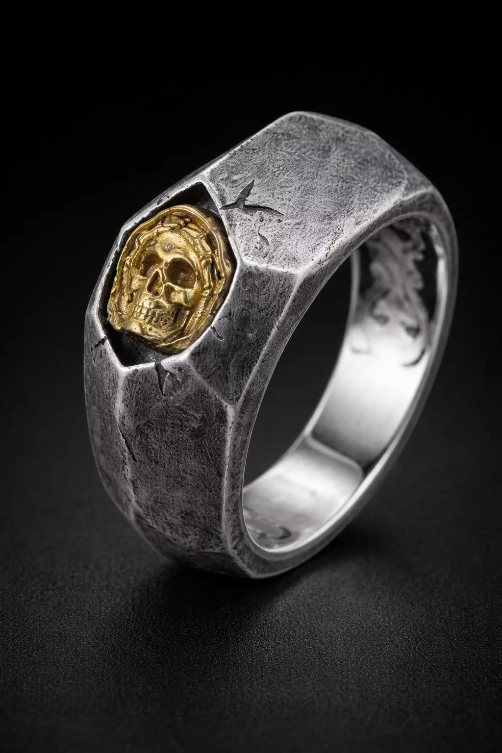 Capture a bold, Neo-Heritage aesthetic with this masterfully crafted skull signet ring. Featuring a striking skull motif embedded within a rugged, distressed gold surface, this piece perfectly balances ancient symbolism with a modern, industrial edge. The hammered texture and cracked design provide a unique, weathered look, making it an ideal statement piece for those who appreciate gothic-inspired luxury and artisanal detail.