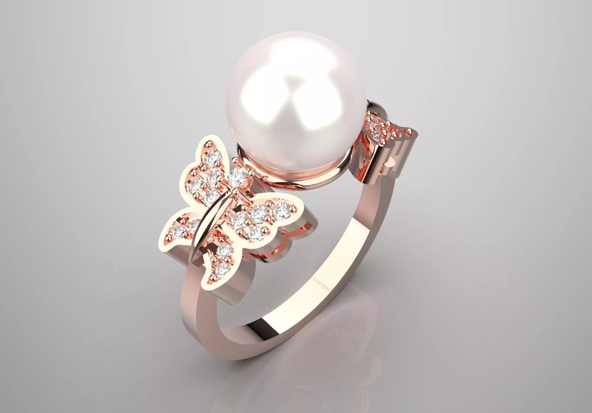 This charming ring features a large, shiny pearl at its center, beautifully complemented by a butterfly design, creating a beautiful and unique piece. The pearl stands out and shines with a soft, iridescent finish, showcasing its natural beauty and radiance. The arm and butterfly elements are crafted from rose gold, giving the ring a warm and romantic feel.
