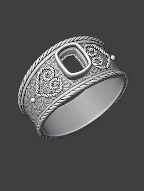 It's a 3D printed ring model, with a vintage shape, reminiscent of Victorian or Byzantine era jewelry, a piece of jewelry that has a central rectangular position for placing a stone of your choice.