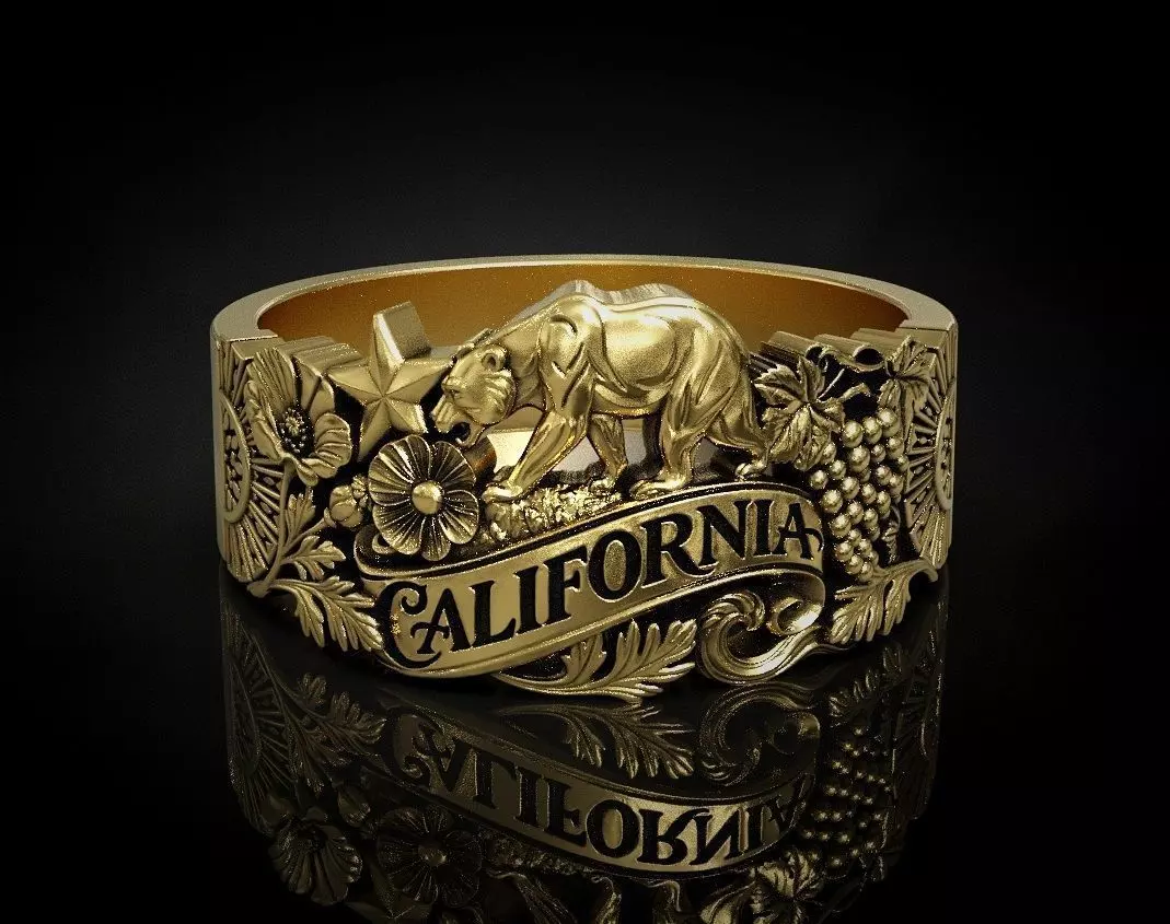 High-quality 3D model of a California-themed relief ring. The design features iconic symbols of the state: the Grizzly Bear, the Lone Star, California Poppies (state flower), and grapevines representing the wine regions. The text CALIFORNIA is prominently displayed on a ribbon banner. This model is designed for jewelry production and is ready for 3D printing and casting.