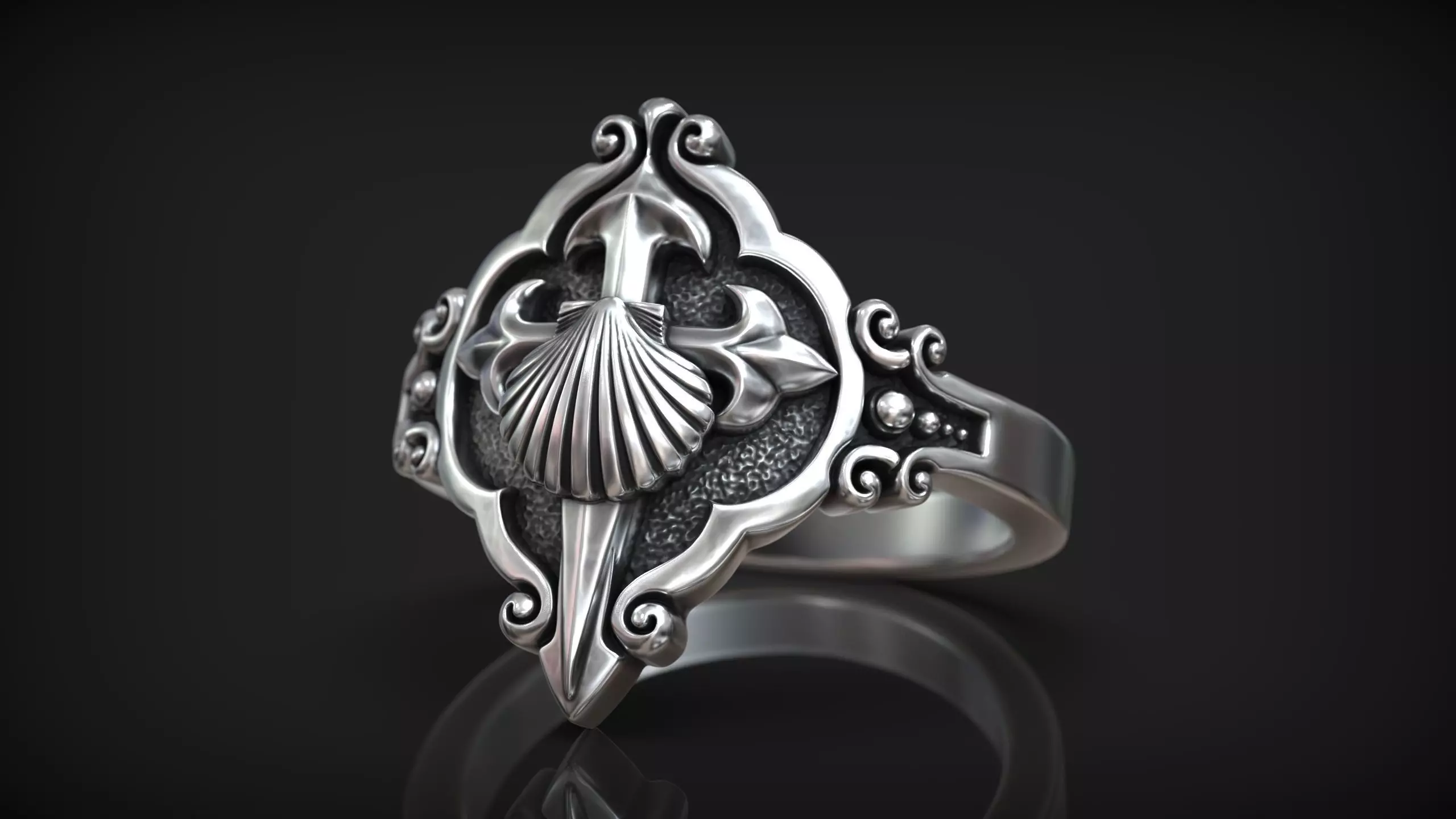 The sculpted frame surrounds the central shell-and-blade composition, giving the ring a noble and spiritual appearance. The side details include ornamental curls and bead elements, adding depth and refinement while keeping the model cast-friendly.