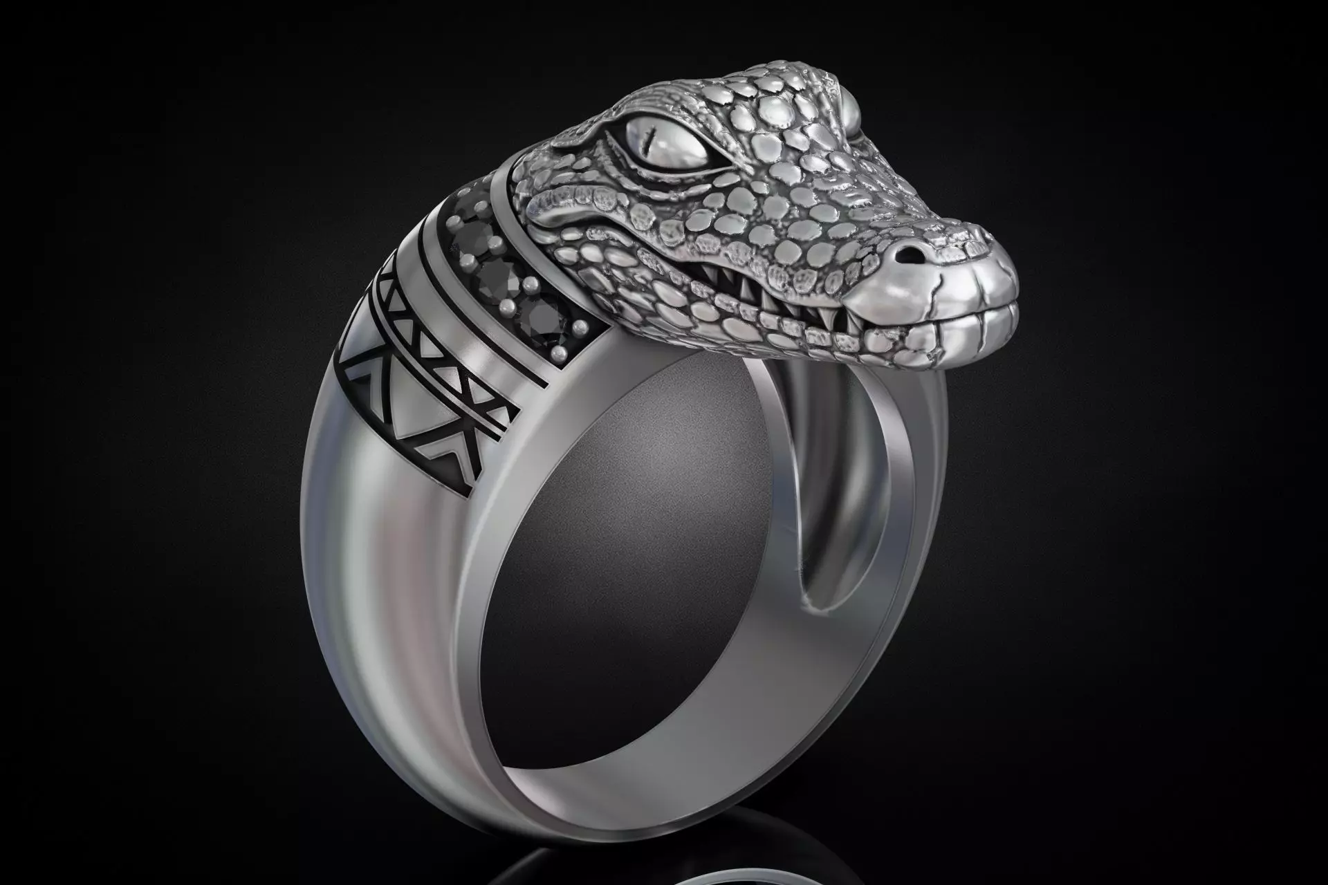 Description:Signet ring featuring detailed crocodile head sculpture with scaled texture, engraved geometric side panels, channel-set round stones on shoulders, tapered shank profile, and pronounced top projection structure.