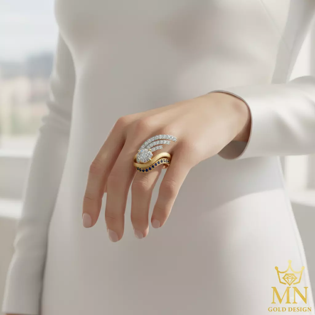 The Celestial Comet Ring is an elegant, luxurious jewelry design inspired by the graceful movement of a shooting star lighting up the night sky.This high-quality 3D model features a brilliant round-cut central diamond, three sparkling diamond-pavé comet trails, and a flowing wave-shaped band adorned with royal blue sapphires.