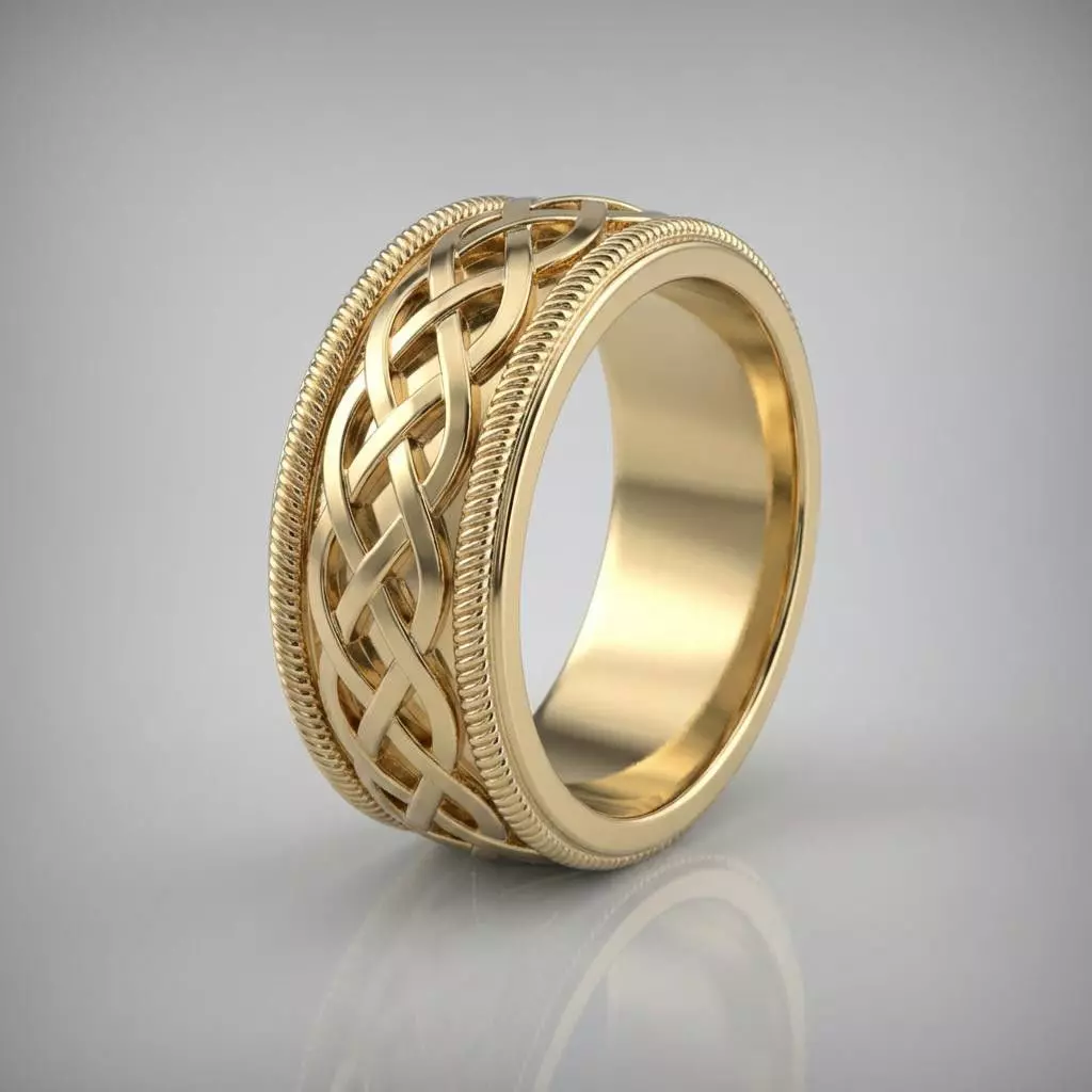 The Celtic Knot Ring is an elegant ornamental band featuring an intricate woven knot pattern inspired by traditional Celtic art. The design symbolizes eternity, unity, and continuity, making it ideal for both classic and symbolic jewelry visuals.