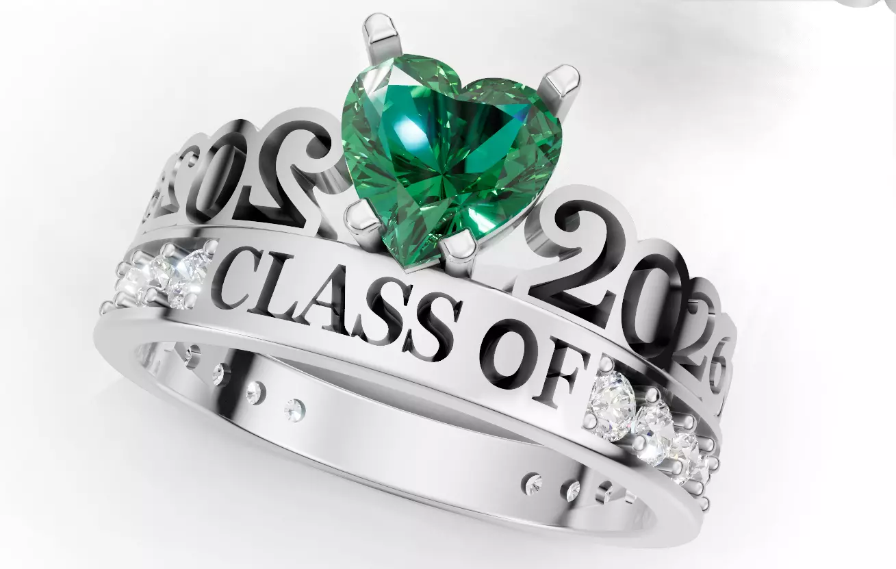 This design features a 6.00mm heart-shaped center stone, with CLASS OF and 2026 in bold lettering.