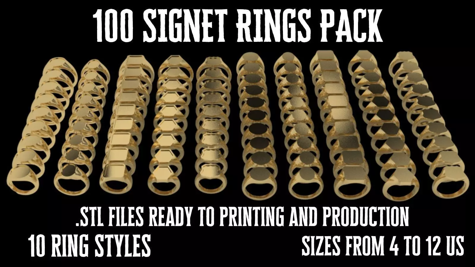 For sale is a collection of 100 Signet ring models, perfect for jewelers and manufacturers. You can use these files as model to create your own signet ring designs. The set includes 10 different ring designs: 5 solid rings and 5 with hollow. The size range covers US sizes 4 to 12. To help with size reference, I’ve attached a chart of international ring sizes in the product images.